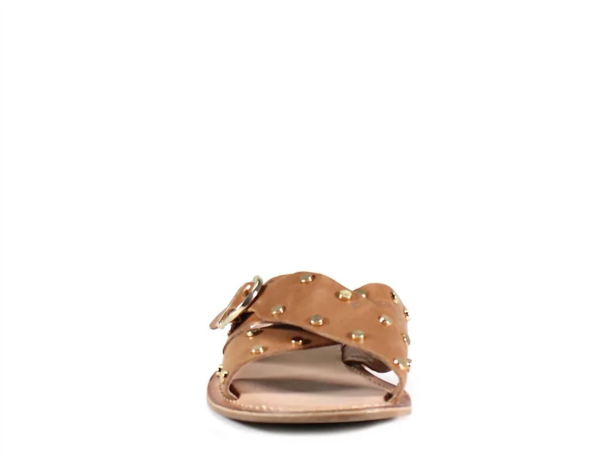 Sandálias elegantes confeccionadas em couro em um tom bronze cativante. A praticidade do calçado se une à elegância. Cabedal com tiras cruzadas adornado com tachas metálicas. Fecho com fivela ajustável. Design arredondado e aberto. Palmilha levemente acolchoada para maior conforto. Altura do salto: 1,2 cm. Solado sintético e forro em material sintético.