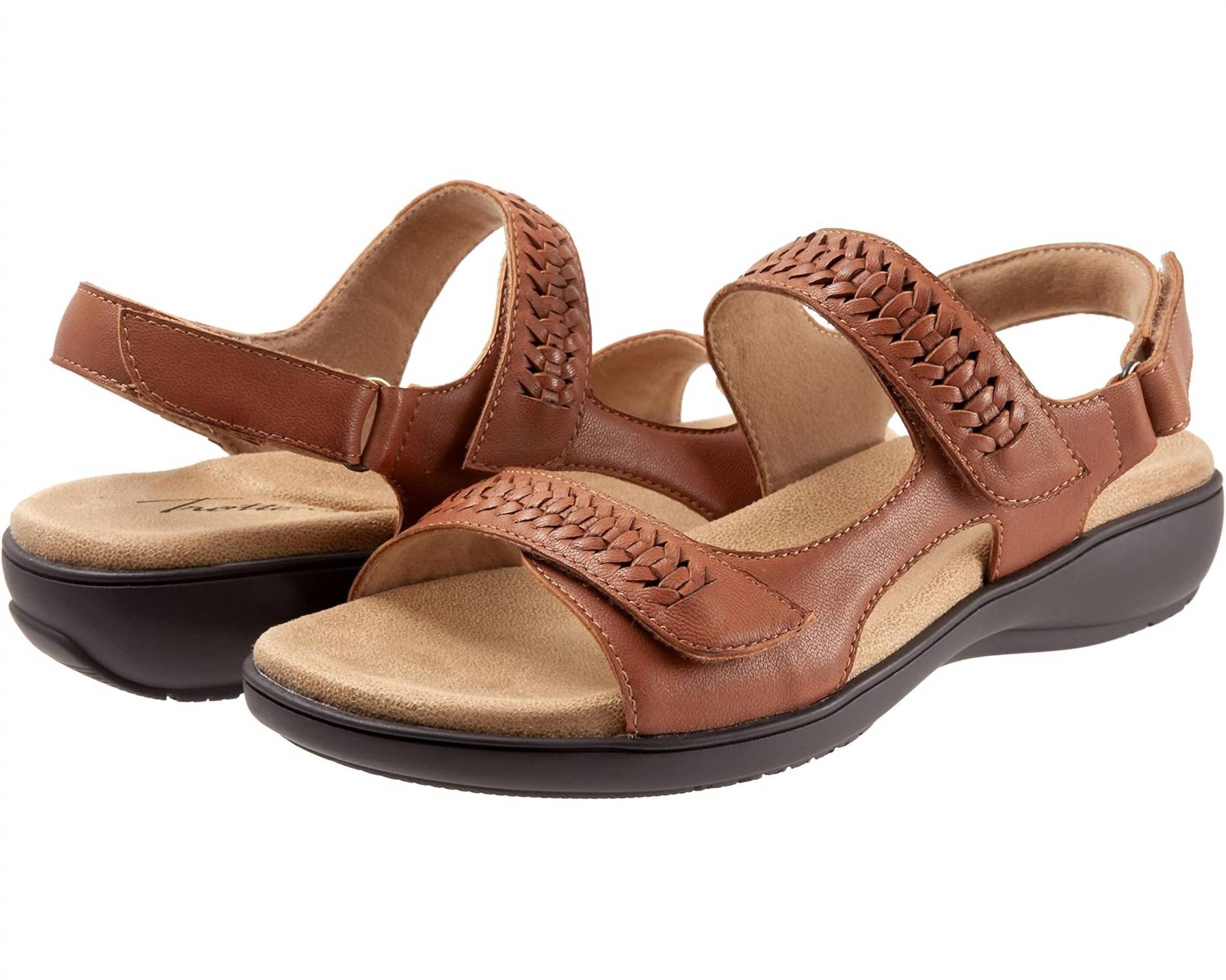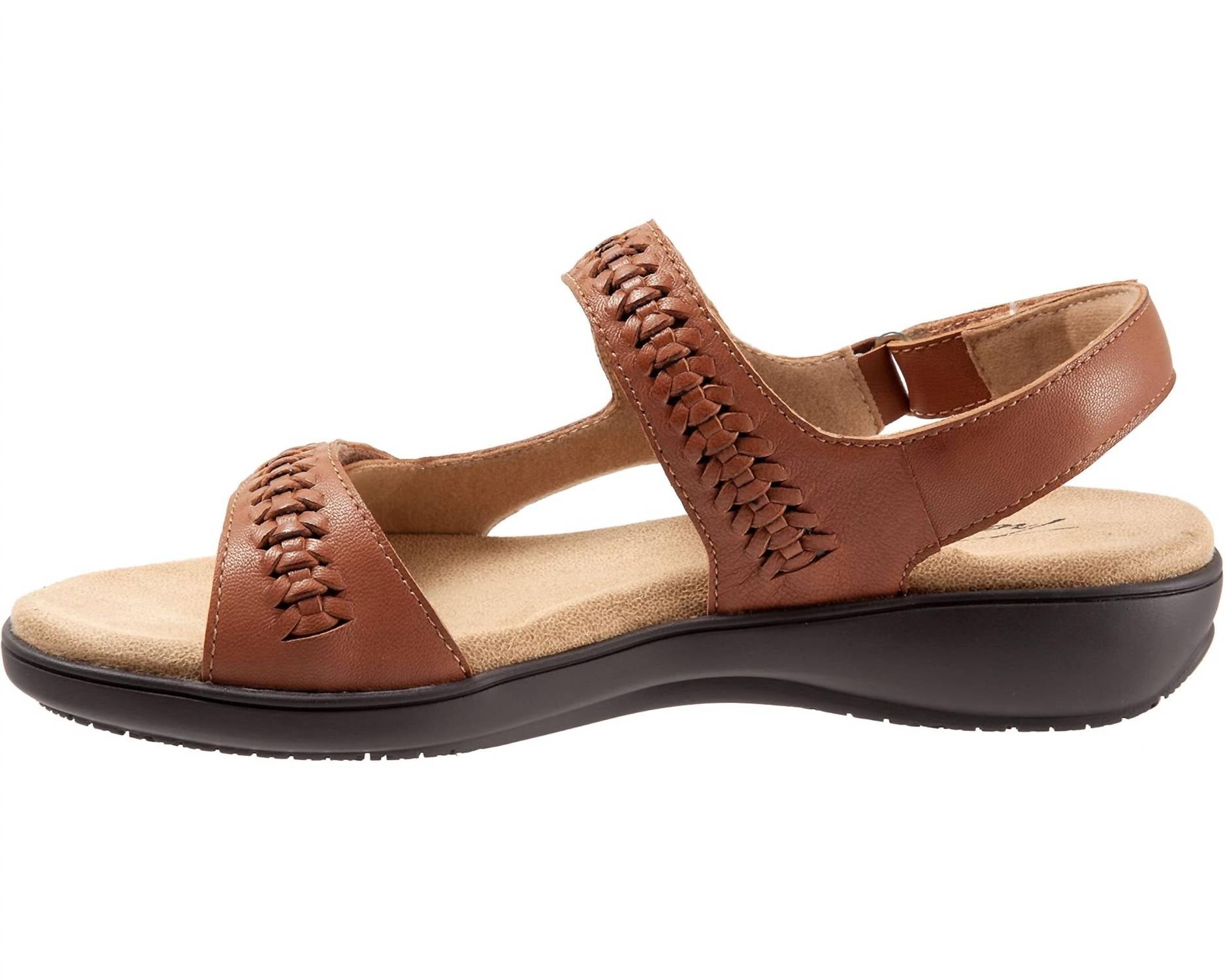 The Women's Romi Sandal by Trotters exudes understated elegance. Crafted with an adjustable leather upper, it features a Memory Foam footbed and a lightweight rubber sole for ultimate comfort. It boasts an open toe design and a platform heel with a low height of approximately 1.25 inches.