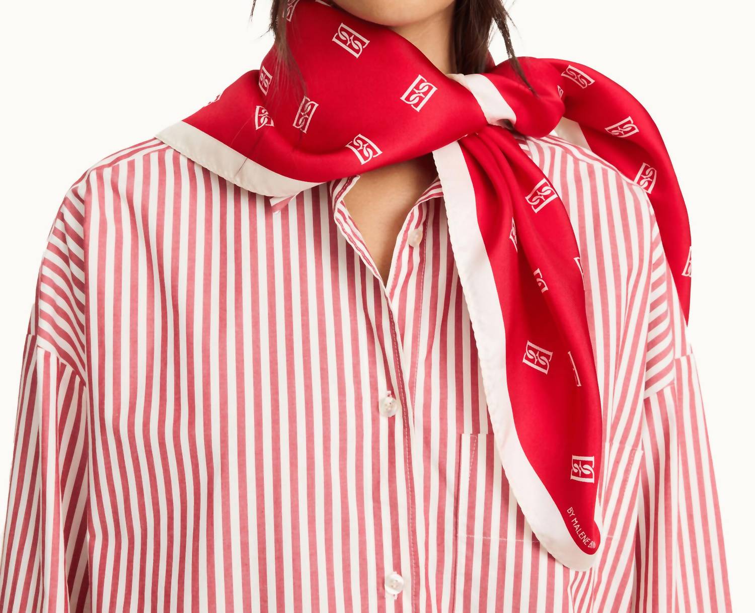 Elevate your accessory collection with the Monnas Silk Scarf by BY MALENE BIRGER, showcasing a luxurious red shade with an elegant monogram print. Crafted from 100% silk, this classic piece exudes sophistication and timeless style. Perfect for adding a touch of class to any outfit, this scarf is an essential wardrobe staple.
