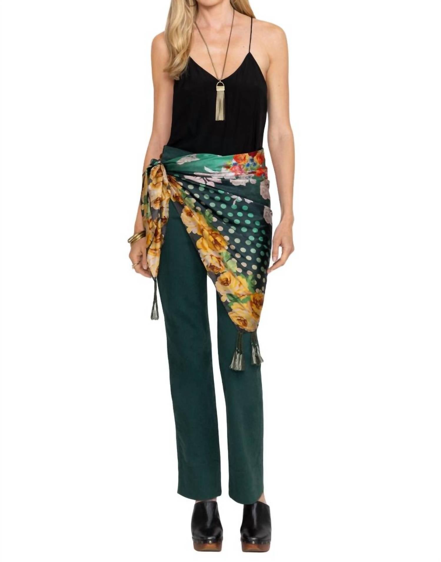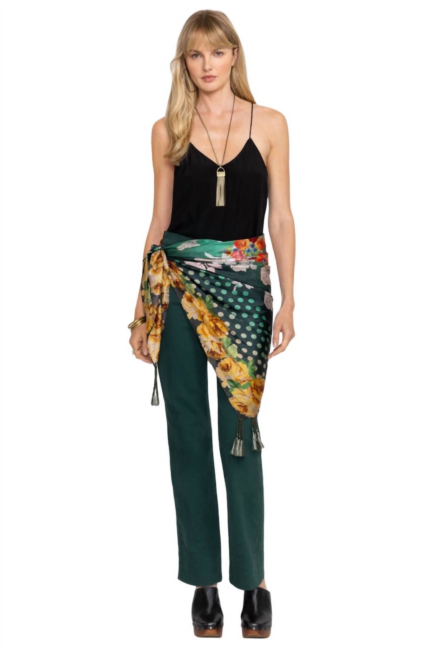 Clássico e versátil, com infinitas maneiras de usá-lo. Apresentando uma variedade de padrões brilhantes e ousados sobre um fundo verde intenso, este cachecol ousado é finalizado com borlas decorativas nos cantos. 100% seda. Medidas: 111 cm x 111 cm. Lavar à mão. Secar na horizontal. SKU: C90124-8.