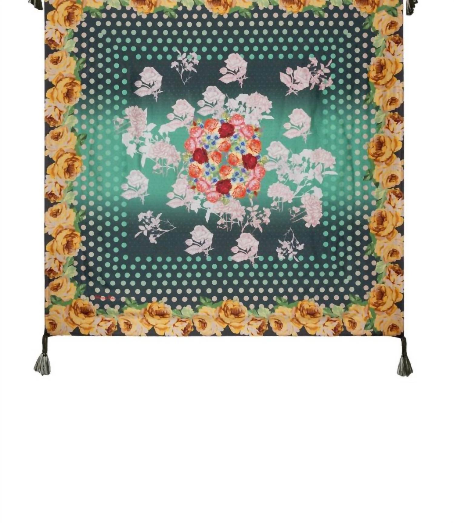 Apresentando uma variedade de padrões brilhantes e ousados sobre um fundo verde intenso, este cachecol ousado é finalizado com borlas decorativas nos cantos. 100% seda. Medidas: 111 cm x 111 cm. Lavar à mão. Secar na horizontal. SKU: C90124-8.