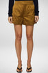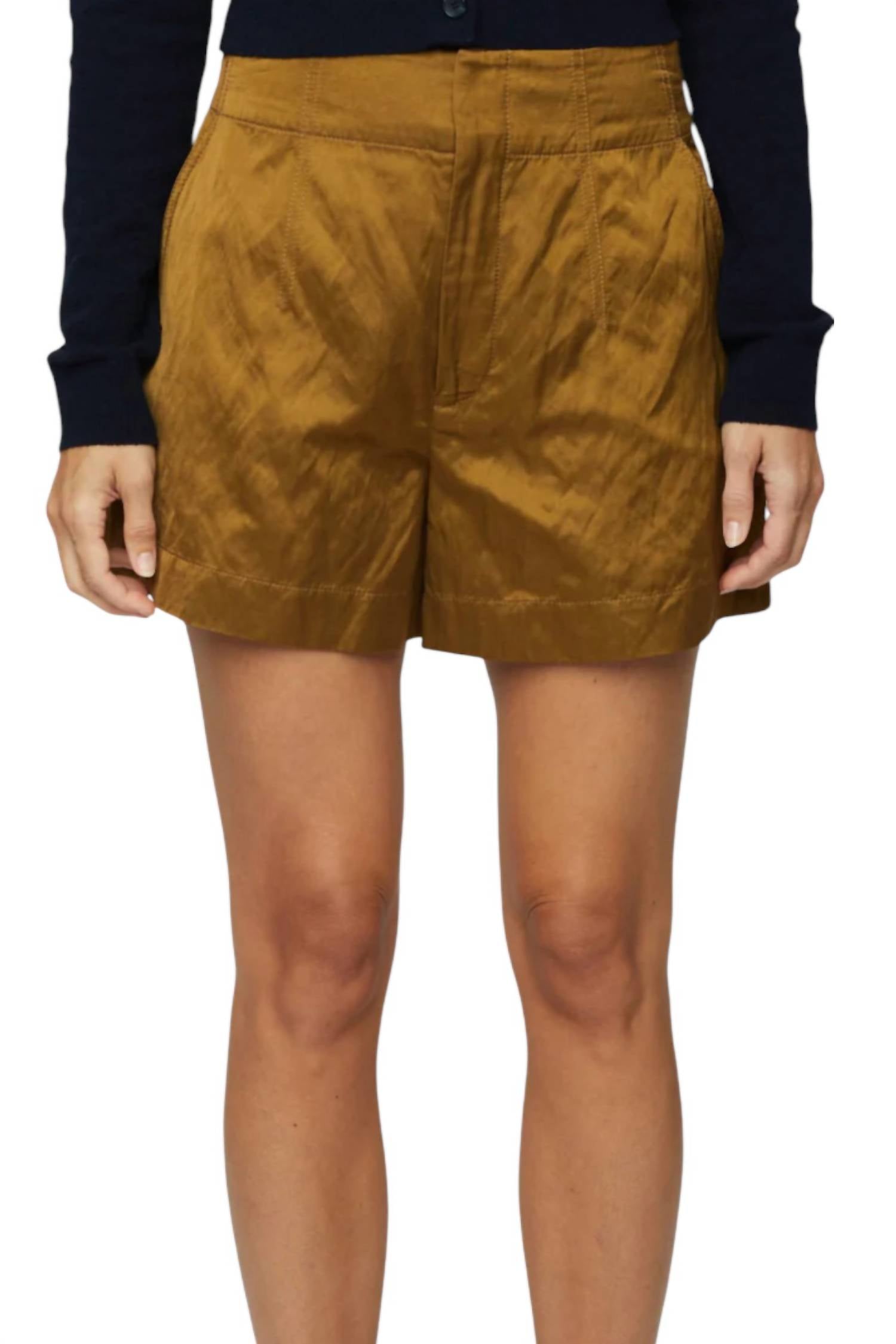 Embrace boho chic style with the Benny Metal Satin Short by A.L.C., perfect for a beach day or Easter celebration. These aged bronze high-waist shorts are crafted from a cotton blend consisting of 49% viscose, 46% cotton, and 5% metal, featuring a slim fit and skinny leg design. They come with a convenient zip closure and handy pockets, accentuating their practicality. Care for your shorts with a dry clean to maintain their vibrant hue and structured silhouette.