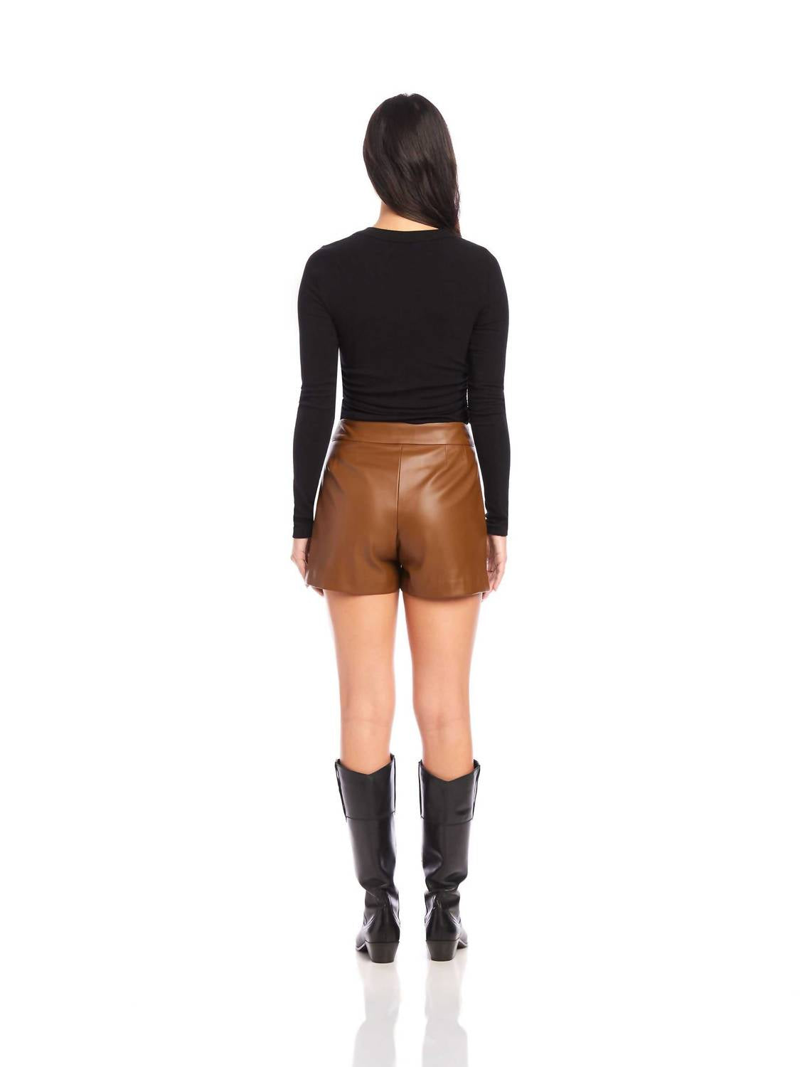 Com um ajuste perfeito, nós amamos esses shorts de cintura alta e você também vai adorar. Eleve seu estilo com o Shorts Moderno de Cintura Alta em Couro Sintético da Fifteen Twenty, que oferece um toque luxuoso em um tom caramelo intenso. Este shorts tem cintura alta para um caimento perfeito e é confeccionado em couro sintético 100% poliuretano. Fabricado nos EUA com tecido importado, inclui bolsos laterais funcionais e fecho frontal com gancho e zíper. Dimensões: 10 3/8 polegadas de altura na frente, 3 3/8 polegadas de comprimento na entreperna e 23 3/4 polegadas de largura na perna (tamanho 4). Instruções de cuidado: Lavar à mão com água fria, secar na horizontal e não lavar a seco.