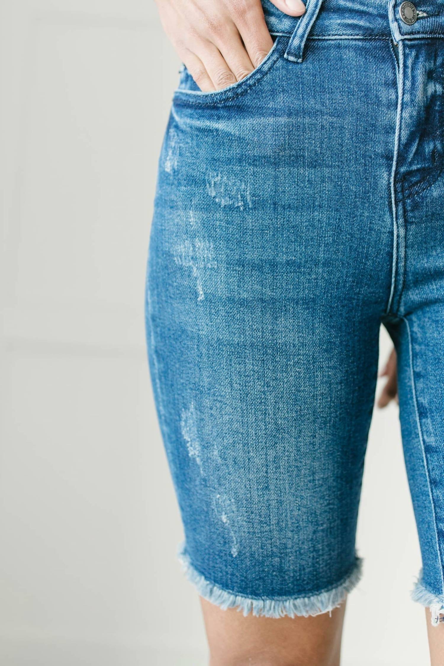 Uma versão feminina e elegante da bermuda clássica. Confortável o suficiente para relaxar e charmosa o suficiente para usar na sua próxima saída em dias quentes. Cintura alta. Detalhes levemente desgastados. Bainha desfiada. 94% algodão, 5% poliéster, 1% elastano. Lavar com água fria, pendurar para secar. Tamanho real.