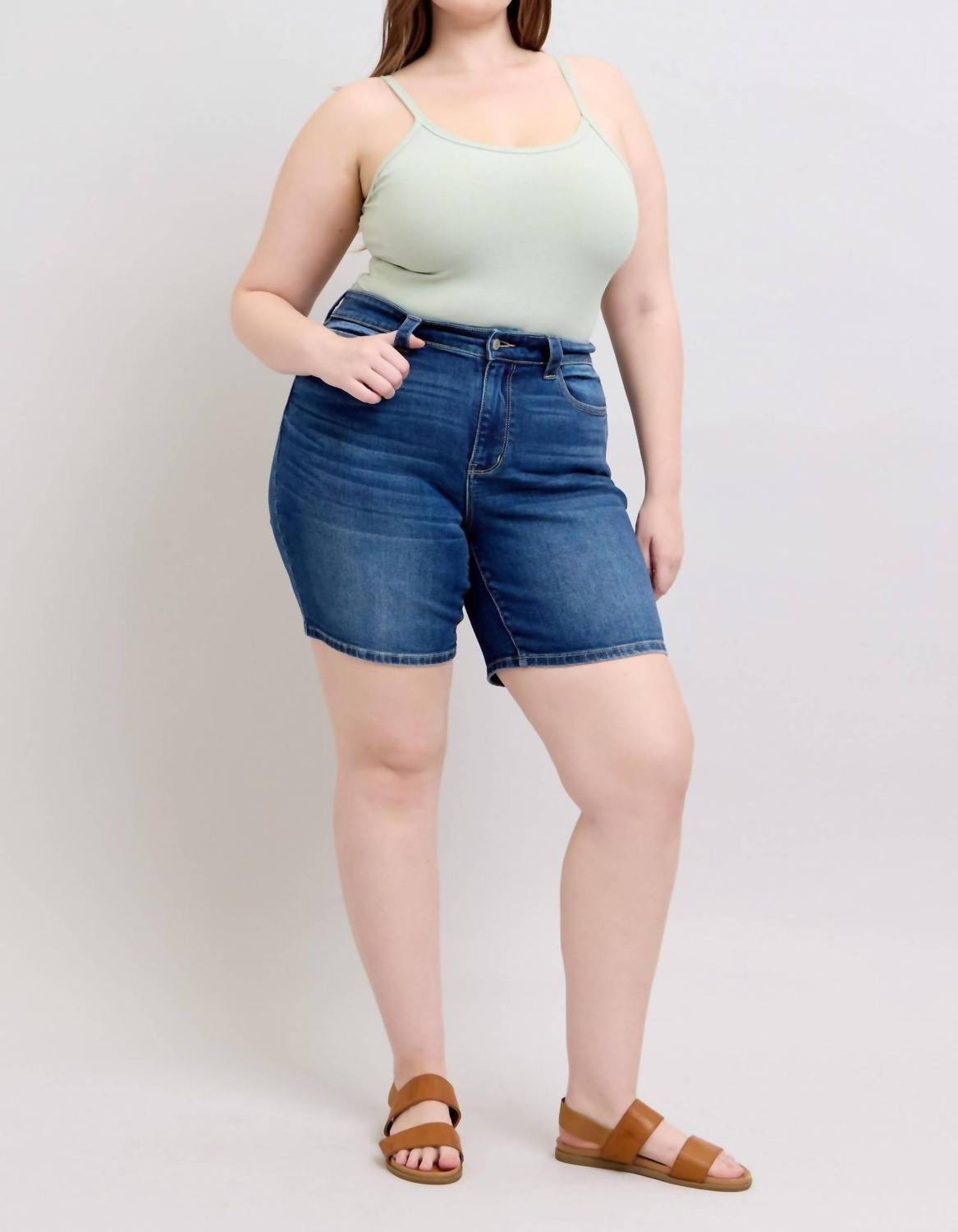 O Short Jeans Bermuda Judy Blue de Cintura Alta com Bolso Traseiro com Aba é um item essencial para o verão. Confeccionado em uma mistura de algodão composta por 93% algodão, 5% poliéster e 2% elastano, este short promete um ajuste confortável com um pouco de elasticidade. Com fecho de botão, tem 26 cm de altura frontal para os tamanhos P-GG e 30 cm para os tamanhos GG-3GG, com costuras internas de 17 cm e 20 cm, respectivamente. Este short de cor sólida e lavagem escura é ideal para viagens casuais e pode ser lavado à máquina com cuidado; vire do avesso, lave em água fria e seque em temperatura baixa para melhores resultados.