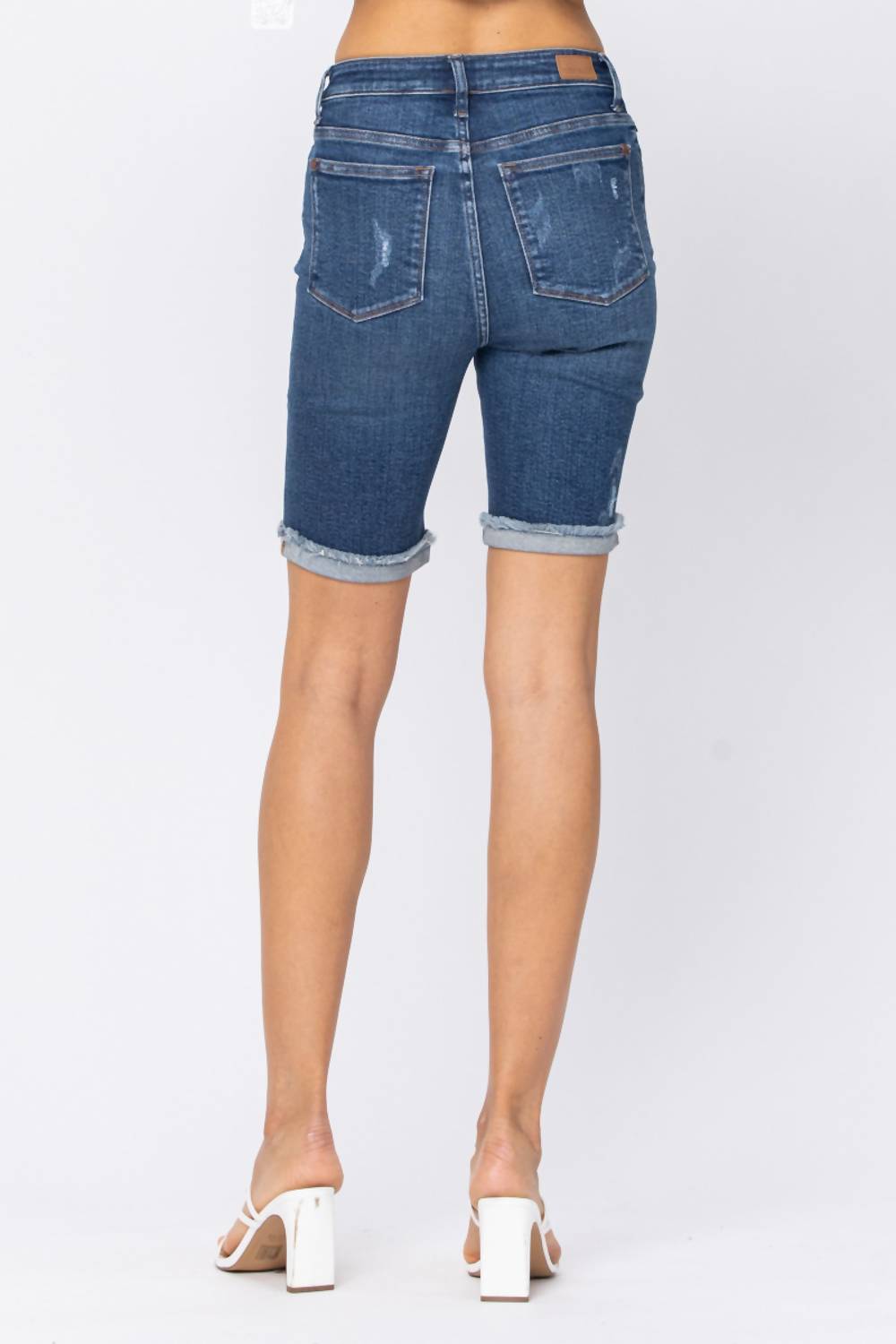 Descubra o essencial para o clima quente com estas elegantes bermudas femininas, habilmente elaboradas para proporcionar uma fusão harmoniosa de moda e funcionalidade. Descubra a Bermuda Judy Blue de Cintura Alta Destroyed, habilmente desenhada para um ajuste elegante e confortável. Esta bermuda azul apresenta um cós alto elegante e uma costura interna de 23 cm com detalhes modernos em efeito desgastado. Confeccionada em uma mistura de algodão de 94% algodão, 5% poliéster e 1% elastano, oferece elasticidade perfeita. Fechamento: Botão. Este shorts possui um punho sem acabamento para um toque especial, tornando-o um complemento chique para qualquer guarda-roupa. A modelo veste tamanho pequeno (altura de 1,75 m, cintura de 61 cm, quadril de 86 cm).