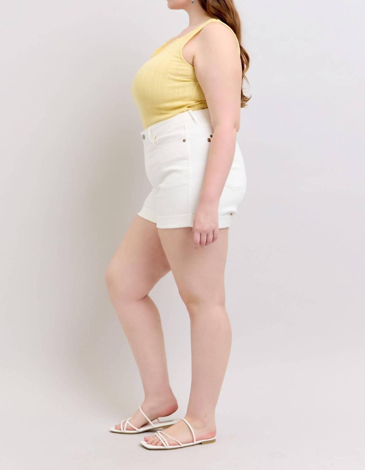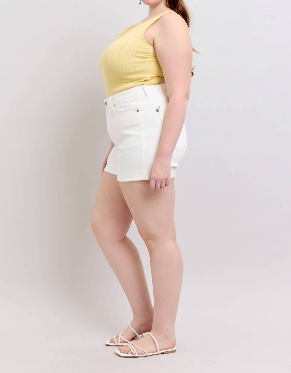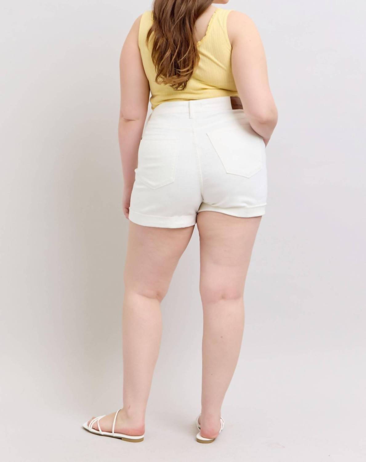 Eleve seu guarda-roupa de verão com o short jeans Judy Blue de cintura alta com punhos duplos, perfeito para viagens de férias ou comemorações do 4 de julho. Projetado para mulheres que aderem à tendência Y2K, este short branco liso apresenta uma composição de algodão misto de 93% algodão, 6% poliéster e 1% elastano, garantindo conforto e flexibilidade. Este short possui fecho de botão e bolsos práticos, com cintura alta e variações de entrepernas de 10,8 cm ou 12,7 cm, dependendo do tamanho. Os cuidados são simples: lavar à máquina em água fria, secar ao ar livre ou secar em temperatura baixa para manter a qualidade.