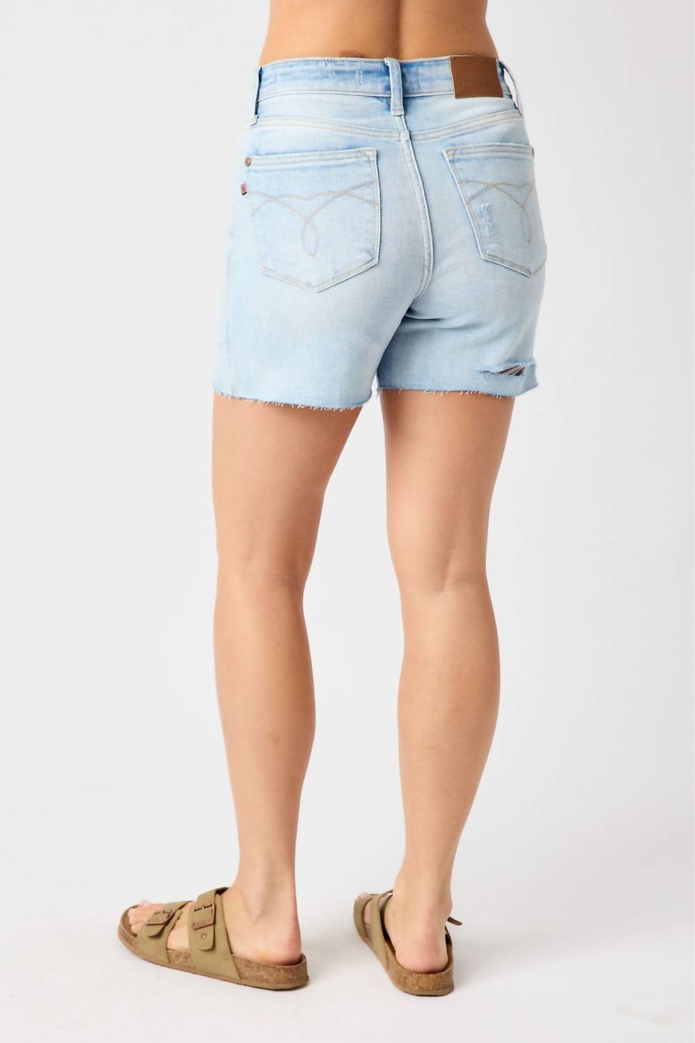 Descubra o short Judy Blue de cintura alta com um detalhe moderno e destruído nas costas, perfeito para um toque de nostalgia dos anos 90 nesta primavera. Este short azul sólido é confeccionado em uma mistura confortável de 93% algodão, 5% poliéster e 2% elastano, oferecendo um caimento perfeito. Com costura interna de 14 cm e cós frontal de 30 cm, ele conta com bolsos práticos e fecho de botão para facilitar o uso. Cuide dele com uma simples lavagem à máquina, ideal para shows ou comemorações casuais do 4 de julho.