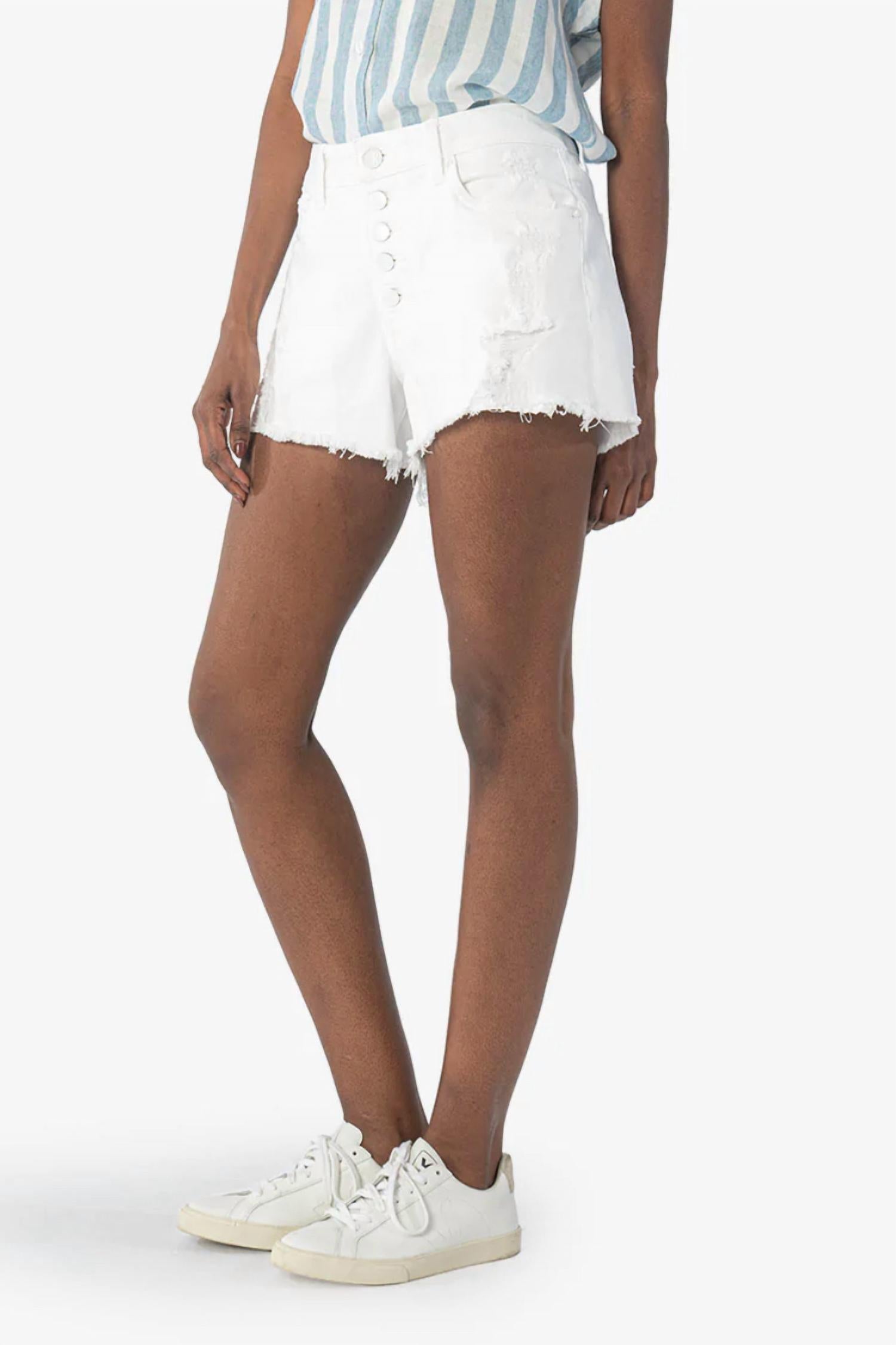 Coloque sua camiseta favorita dentro deste short de cintura alta para uma sensação mais casual e descolada. Este short Jane Distressed High Rise apresenta um design de cintura alta com uma elegante lavagem branca e bainhas desfiadas. Feito de 72% algodão, 27% poliéster Repreve e 1% elastano, possui costura interna de 7,6 cm, abertura de perna de 66 cm e cós de 26 cm com fecho de botão para um ajuste confortável.
