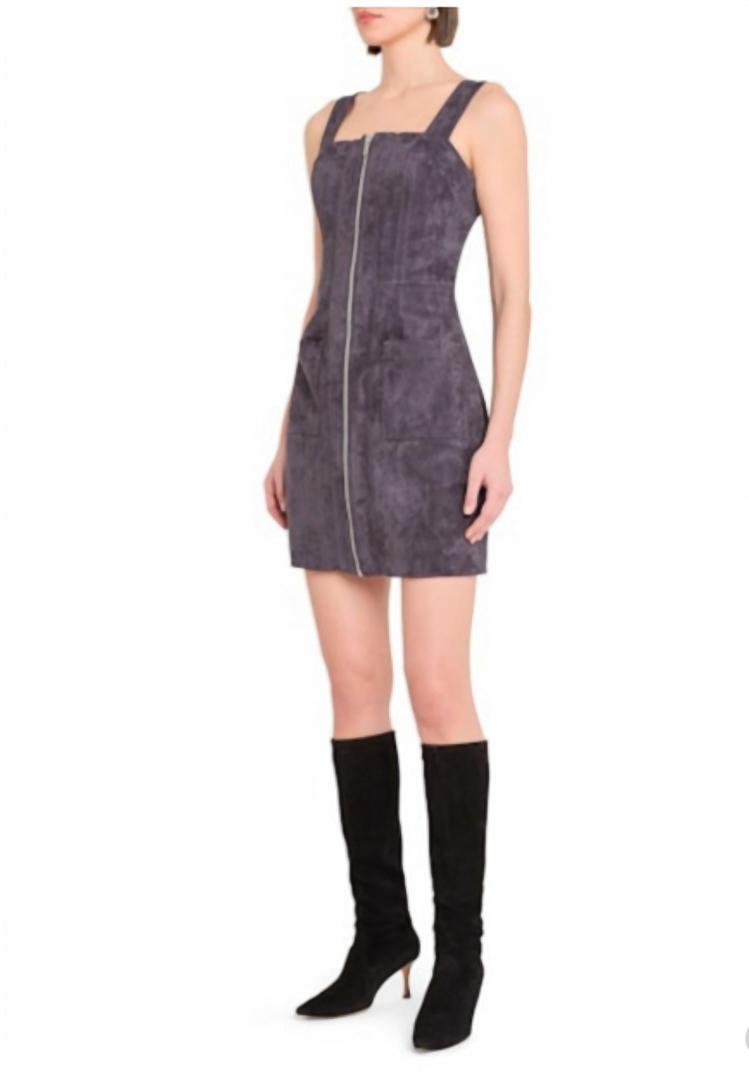 The perfect mini skirt does exist. The Amanda Uprichard Becker Mini Dress in graphite is a chic sheath silhouette perfect for fall evening events. Crafted from solid faux suede with a squareneck design, this sleeveless dress features practical patch pockets and wide adjustable straps for a customizable fit. Closure: Front zip. Ideal for streetwear trends, it's a standout piece for Thanksgiving or other special occasions.