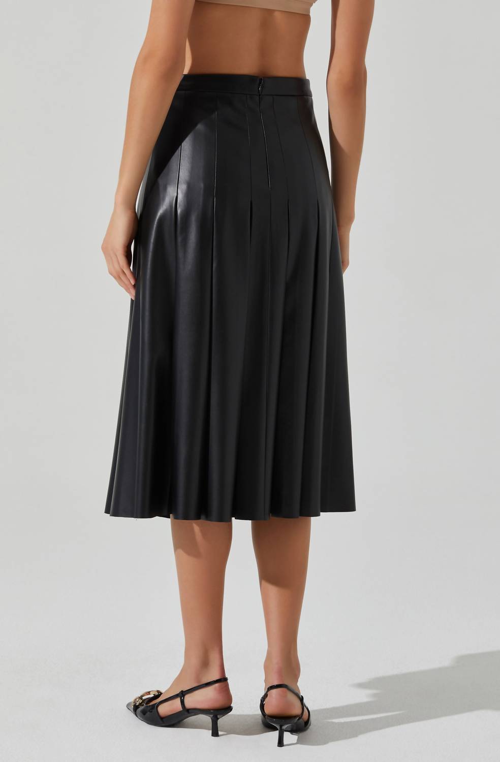 Elevate your fall wardrobe with the Vena Pleated Faux Leather Skirt by ASTR, an elegant midi skirt in timeless black. Crafted from 45% polyurethane and 55% polyester, it features a partially lined short skirt lining and a concealed center back zipper with a hook closure. For best results, this skirt should be dry cleaned only. The model, wearing a size S, stands at 5'10". Ideal for engagements or Thanksgiving gatherings, this skirt embodies quiet luxury with its solid pattern and refined design.