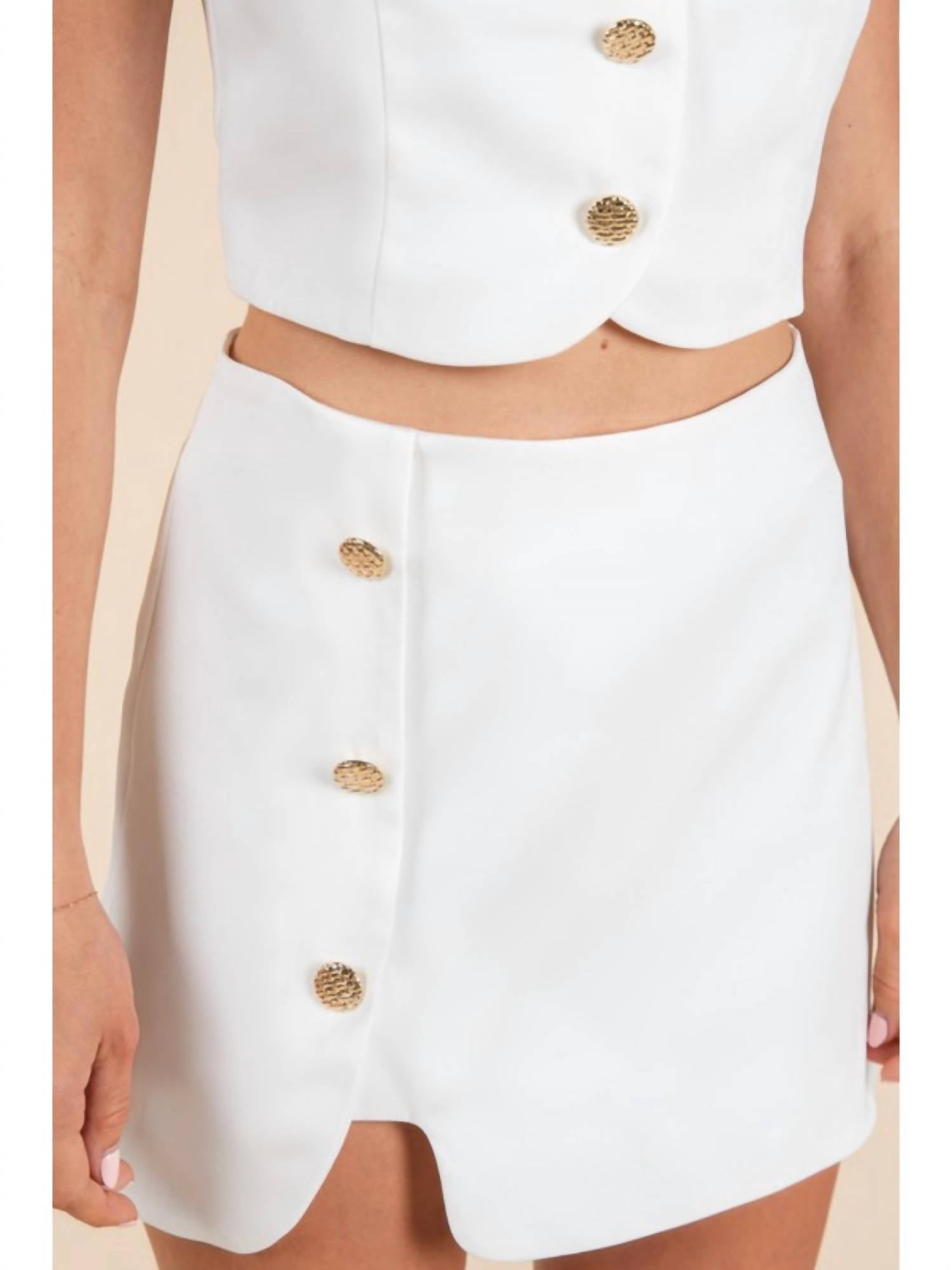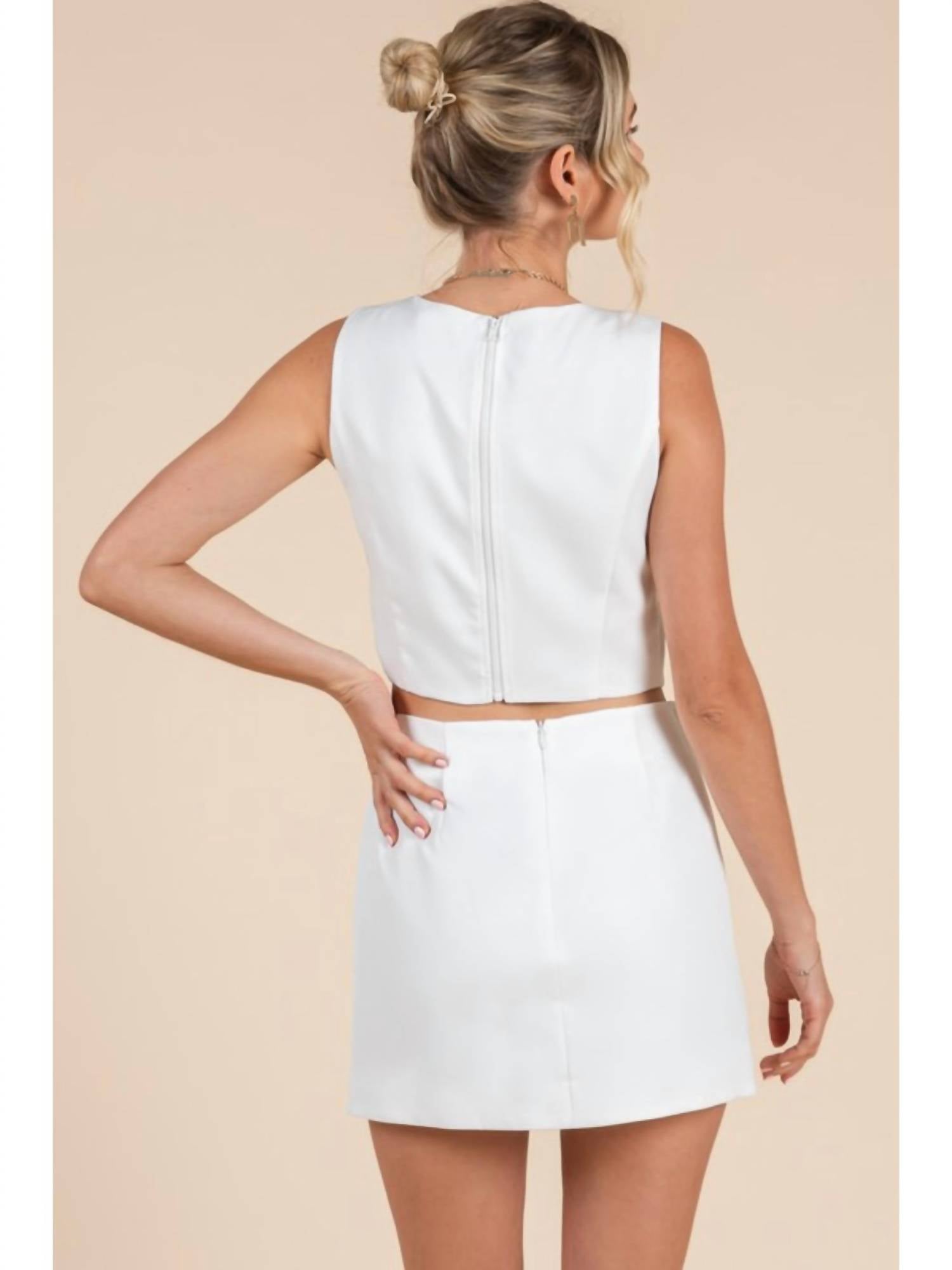 Elevate your spring wardrobe with the Wavy Top & Skirt Set by BABY PINK, tailored for the modern woman. This chic ensemble in timeless white features a wavy hemline crop top paired with a matching skirt, accented by gold button details. The back zipper closure ensures a seamless fit while both pieces are fully lined for comfort. Care for this solid-patterned set by dry cleaning to maintain its quiet luxury appeal perfect for cocktail parties or romantic Valentine's Day occasions.