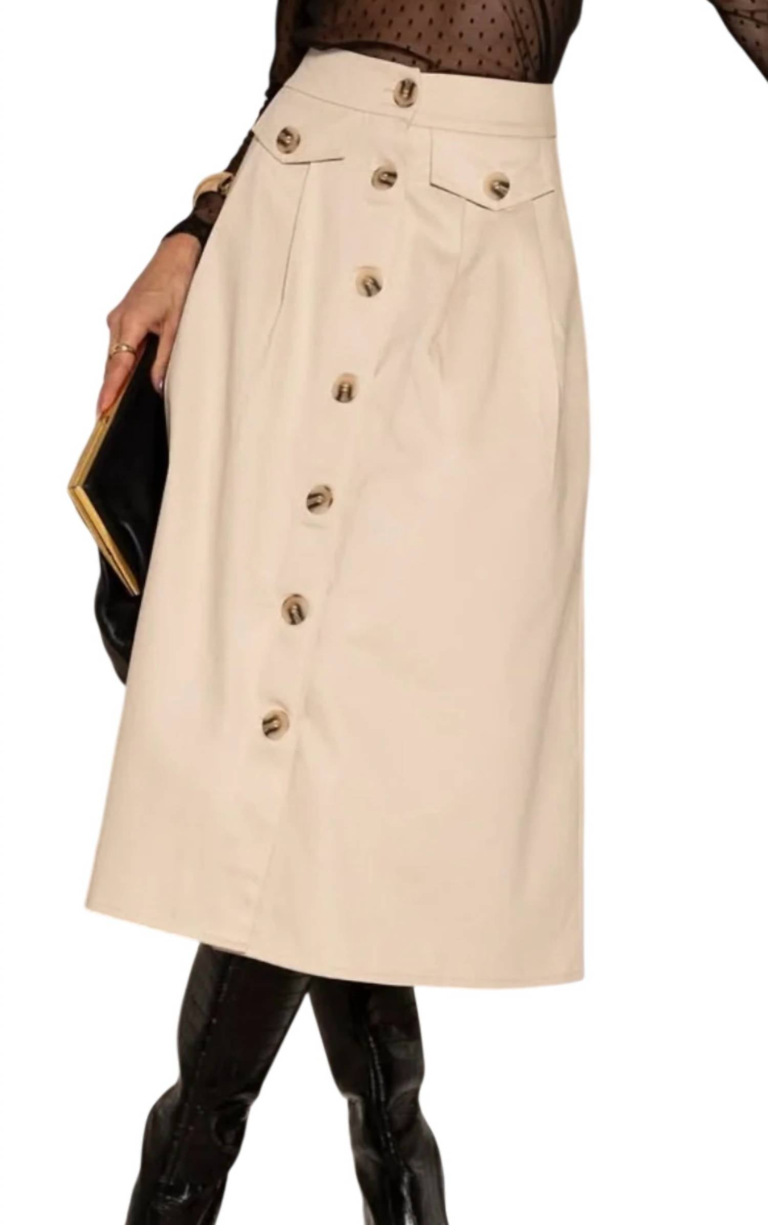 Introducing the Sarja Caqui Midi Skirt by Bambola, an epitome of quiet luxury for a sophisticated fall look. This women's midi skirt is composed of 100% soft cotton in a solid beige hue and is designed with practical pockets for added functionality. The skirt features a classic button closure to ensure a snug and flattering fit, making it an ideal choice for dinner parties or New Year's Eve celebrations. Care instructions include machine washing, allowing for easy upkeep of this versatile piece.