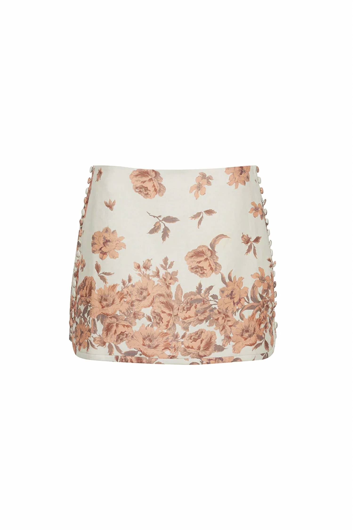 The perfect mini skirt does exist. Chic addition to any wardrobe, perfect for a boho chic spring or Easter ensemble. Women's mini skirt features a floral pattern in Farfella Border Egret. Crafted from 100% linen with a 100% cotton lining. Made in China. Elliptical hem with decorative non-functional side seam buttons and a center back invisible zipper with a hook-and-eye closure. For care, dry clean only or hand wash cold.