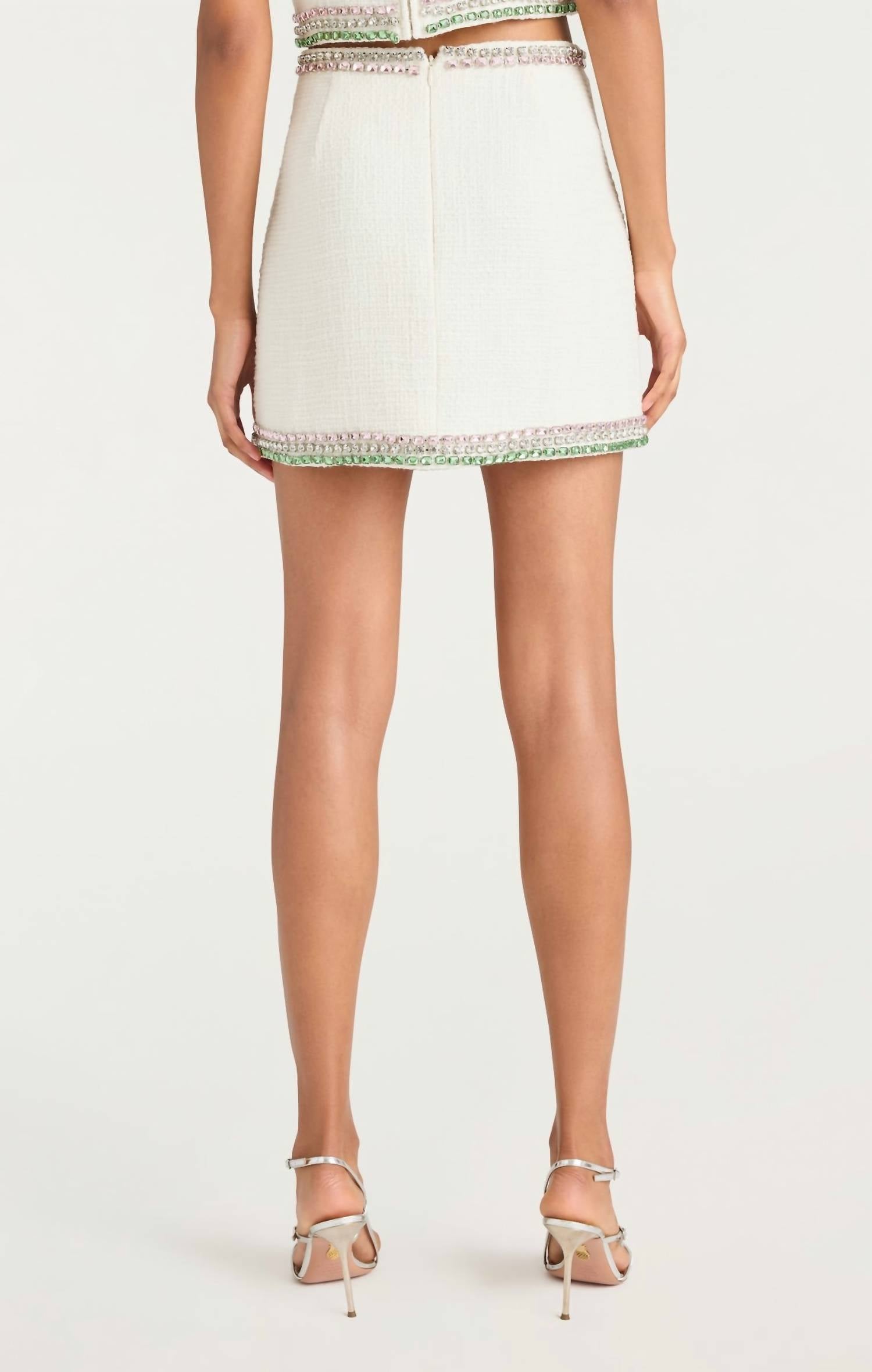 Elevate your style with the Verity Mini Skirt by Cinq a Sept, a masterpiece in Gardenia Multi that embodies quiet luxury. This women's mini skirt is crafted from 100% cotton with a textured pattern and features an elegant embellished trim at the waist and hemline. Experience the sophistication of a zip closure for a seamless fit. Made for summer holiday parties, this skirt should be dry cleaned to maintain its exquisite design.