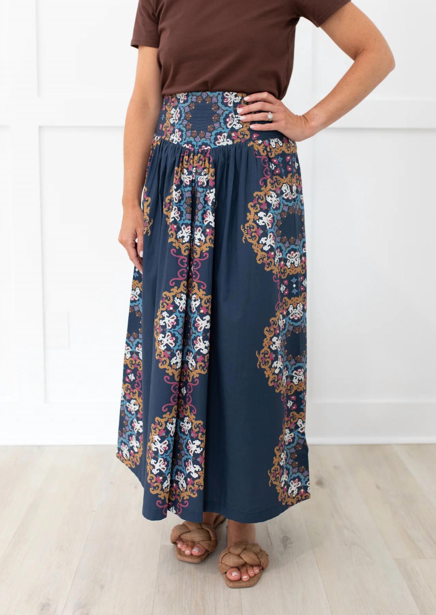 The midi length skirt is here to stay and we especially love this style. Discover the Esmeralda Skirt by Cleobella, an ethically handmade piece from India crafted from 100% GOTS certified organic cotton poplin. This Venezia Blue midi skirt boasts a flowy ankle-length design with a geometric pattern, featuring a quilted stitch detail at the front waist and an elastic back waist for comfort. It embodies 90s fashion trends, perfect for a summer holiday party, especially Thanksgiving. The pull-on closure ensures easy wear, and while specific care instructions aren't provided, it is always best to treat organic cotton with care.