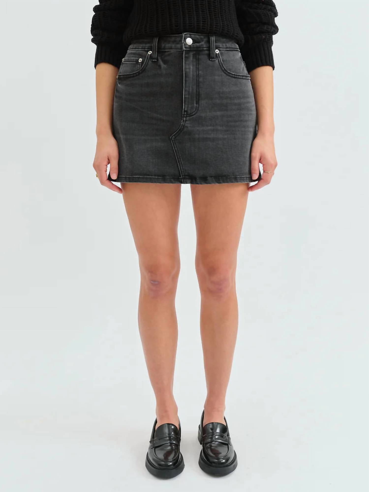 Show just the right amount of leg in this fit flattering mini. Introducing the Malibu Mid Rise Denim Skirt by DAZE, a chic addition to any spring wardrobe. This mini skirt features a flattering mid-rise cut crafted from soft, 100% cotton in a solid black color. Designed for women, it includes convenient pockets and a secure button closure. Care: Machine wash. Perfect for a vacation or Easter outing, it captures the essence of 90s fashion.