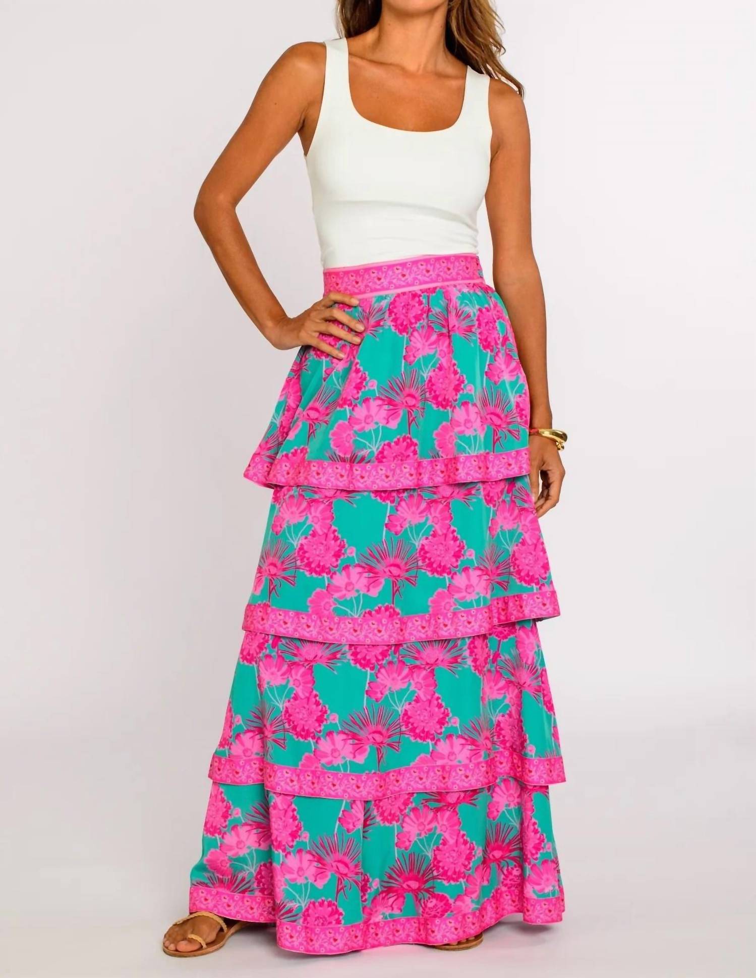 Meet the Eva Skirt by Elizabeth James The Label, a quintessential piece for your Boho Chic collection. This maxi skirt in Plum Flower Teal features a tiered flounce design with a shirred back elastic waistband for a perfect fit. With poly crepe silk composition, it combines elegance with practicality and closes with a convenient side zipper and button. Care for this floral beauty with a machine wash on a gentle cycle and line drying, with options for a warm iron or dry cleaning if desired.