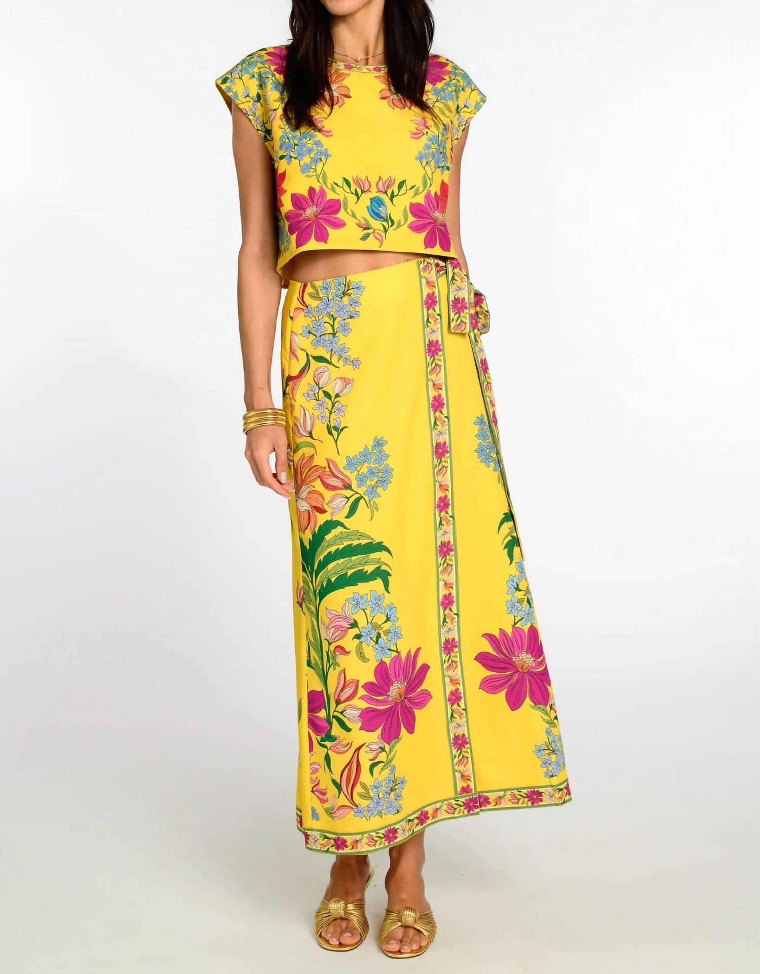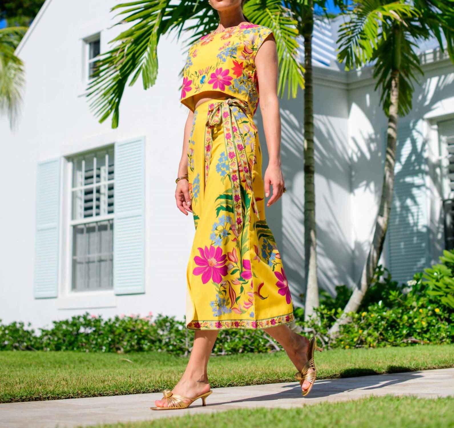 Introducing the Winnifred Skirt by Elizabeth James The Label, a stunning A-Line piece in Tapestry Yellow with a floral pattern. This women's boho chic skirt features a wrap style, straight silhouette, sash tie waist, and a secure back zipper closure, making it a perfect fit for vacation or Thanksgiving occasions. Made from poly crepe silk, it's fully lined and adorned with decorative trim accents. Care for it effortlessly with machine wash on a cold, gentle cycle and line dry, while a warm iron keeps it looking pristine.