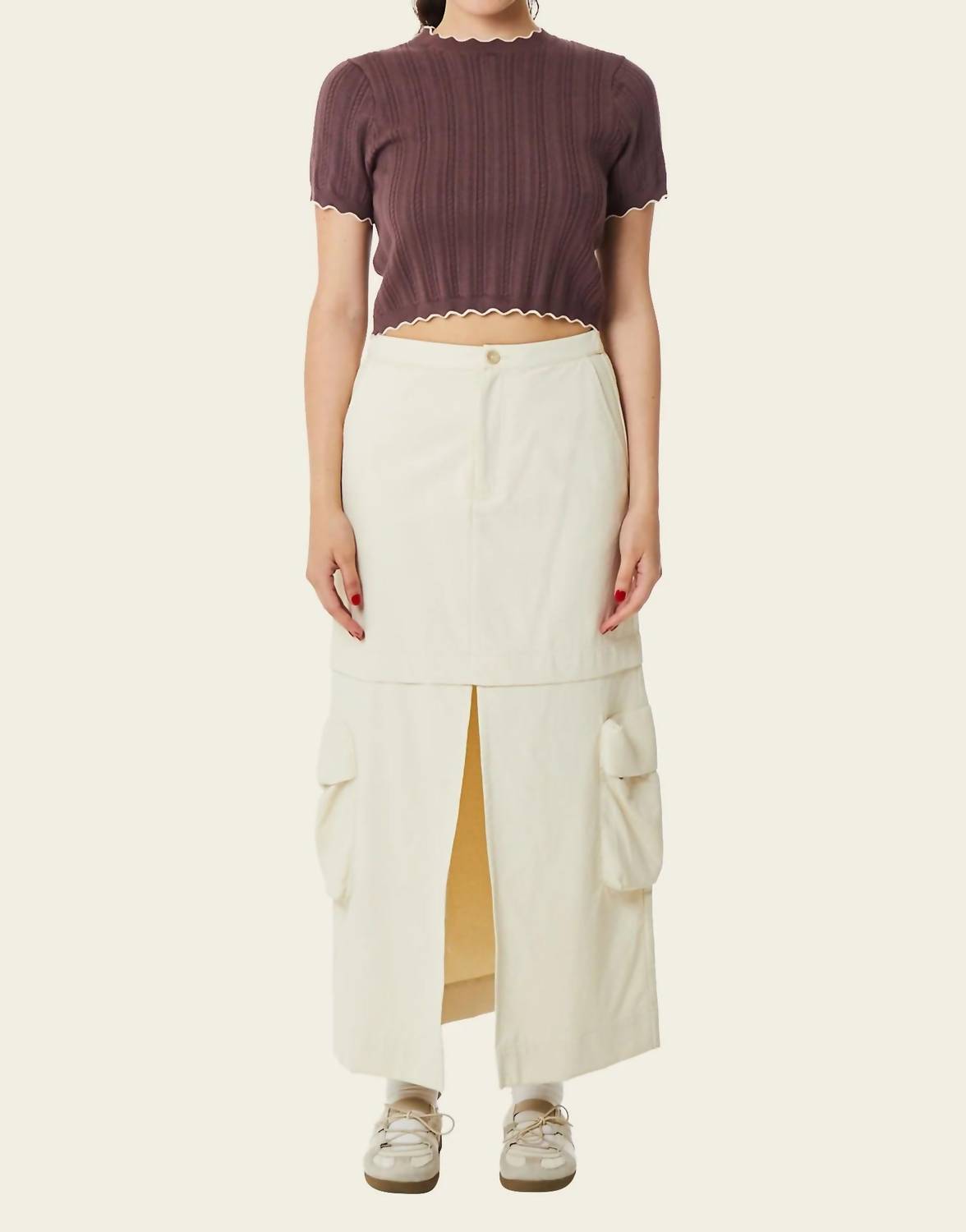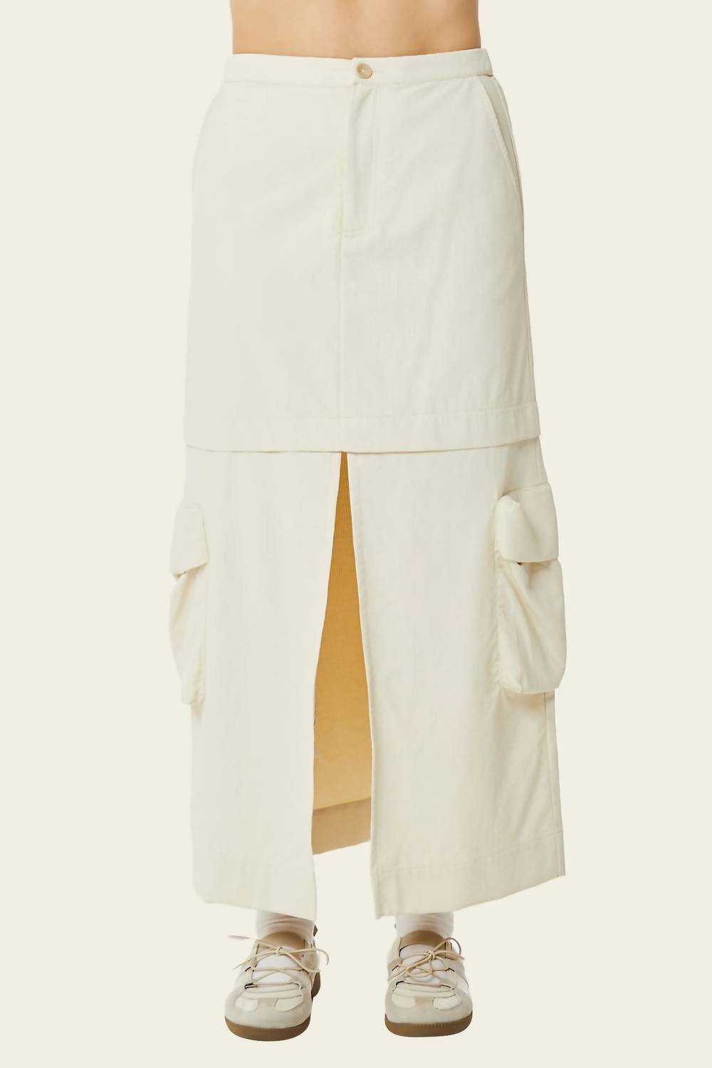 Discover the Owen Cargo Midi Skirt by Find Me Now, a chic addition to your fall wardrobe. In a stylish monochrome Cloud color, this women's cargo skirt features a button closure with convenient front pockets and a center slit for ease of movement. Crafted from a durable cotton blend, it ensures both comfort and style. Care is simple with hand wash cold instructions, and it should be laid flat to dry for best results. The model, standing at 5'8", is wearing a size S.