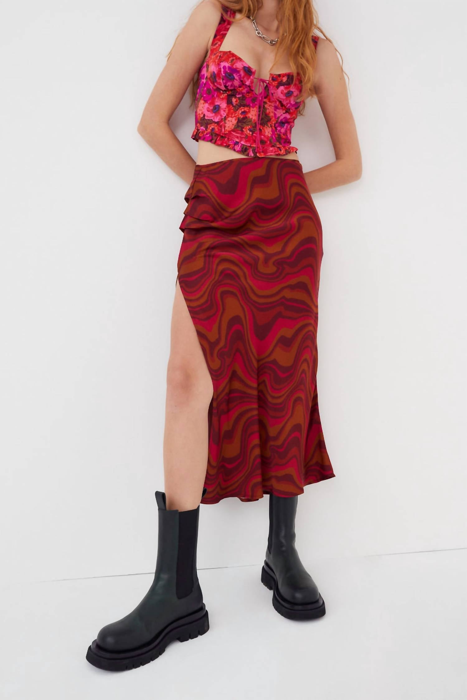 Tuck your favorite tee into this midi length skirt for an effortlessly cool look. Elevate your summer wardrobe with the Eleanor Midi Skirt from For Love & Lemons, featuring a captivating stone swirl print. With a composition of 50% Ecovero and 50% Viscose, this skirt promises comfort and style for your vacation adventures. It boasts a right side slit and an invisible zip closure for a seamless look. Care: Dry clean only.
