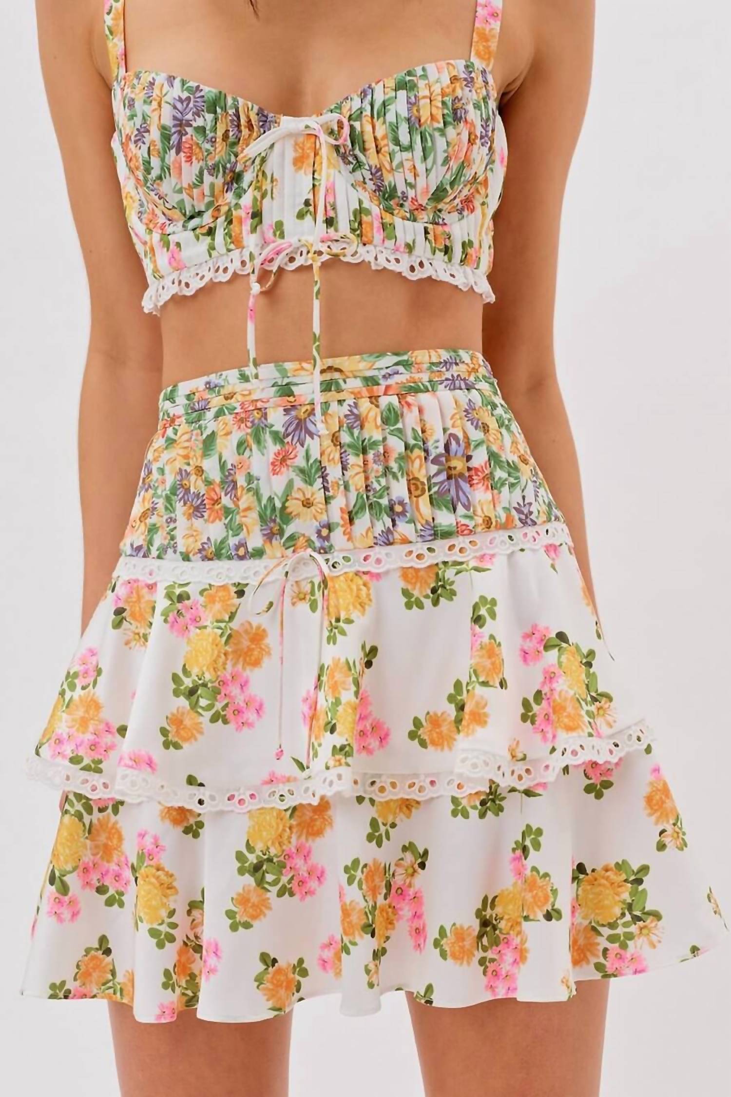Tuck in your favorite tee for a more laid-back vibe. Introducing the Rosalyn Mini Skirt by For Love & Lemons, a vibrant marigold piece perfect for your summer vacation wardrobe. This boho chic mini features a floral pattern with pintucked waist yoke and ruffle skirt tiers, accentuated by contrast cotton eyelet trim along the hem ruffles. Made predominantly with 100% recycled polyester and a lining of 98% recycled polyester blended with 2% spandex, it ensures a sustainable fashion choice. The skirt closes with an invisible zipper at the side seam and requires dry cleaning for care.