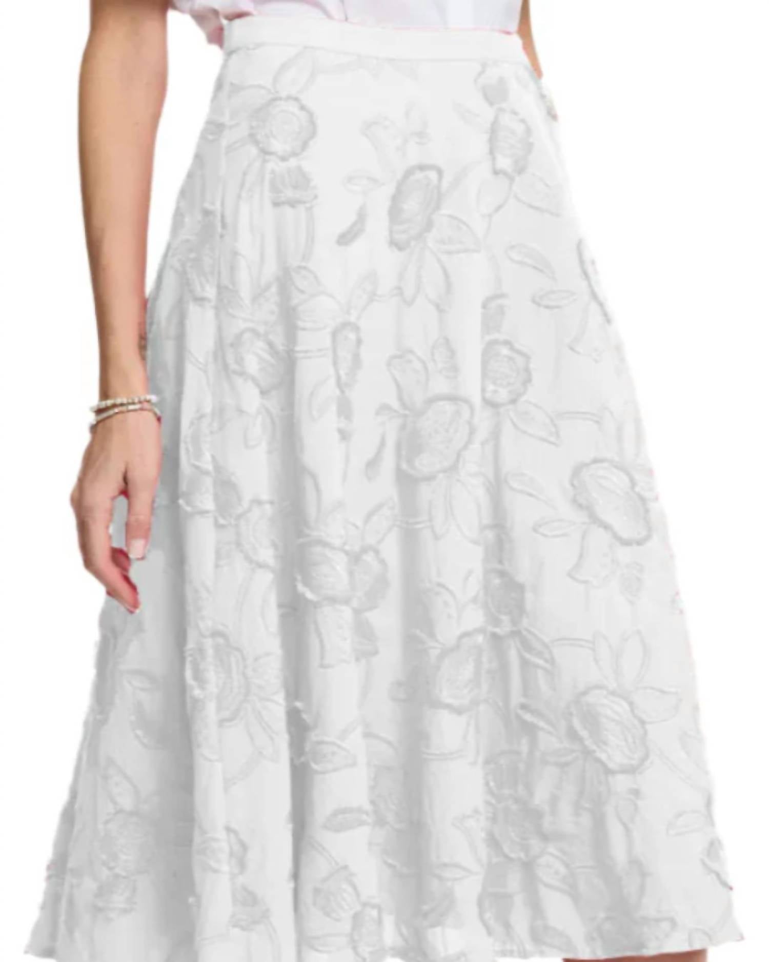 Introducing the Gloria Midi Skirt by Hinson Wu, a sophisticated piece in a pearl hue adorned with floral applique. This A-line midi skirt features a side zipper and a partially elasticized waistband for added comfort. Crafted from 100% cotton, it embodies minimalist elegance perfect for spring and evening events. For care, simply hand wash and line dry or opt for dry cleaning.