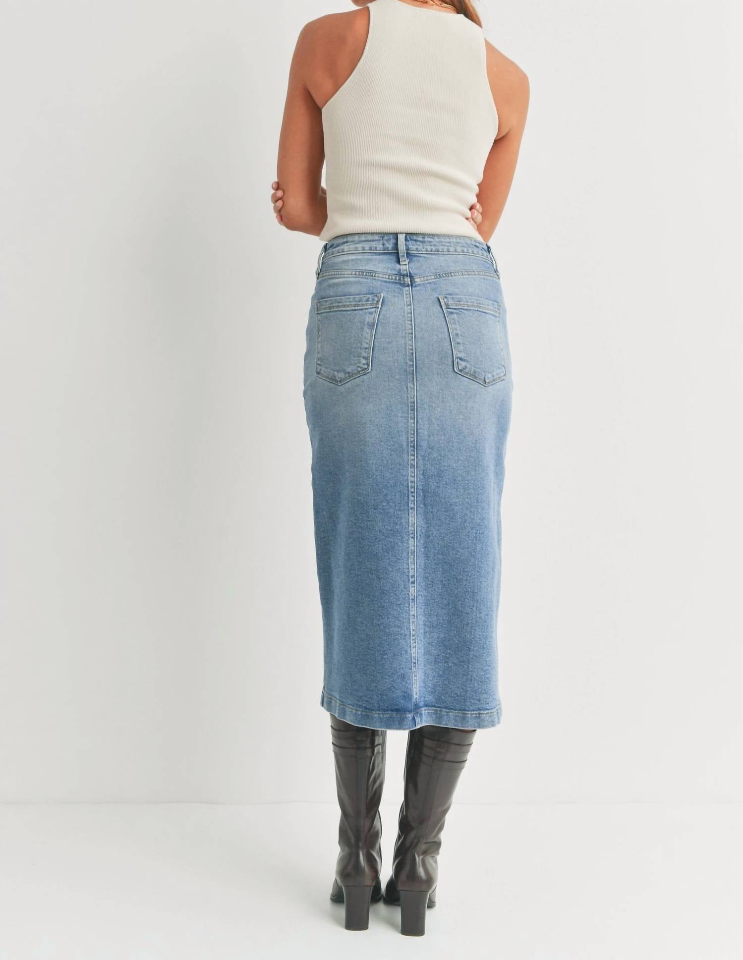 Show off just the right amount of skin in this beautifuly designed midi length skirt. Elevate your fall wardrobe with the Goldie Utility Pocket Midi Skirt by JUST BLACK DENIM, an essential for any minimalist style lover. Crafted from solid medium denim, this skirt features a comfortable stretch and functional pockets, perfect for the modern woman's day out. Made in the United States and designed for the spring season, it ensures style and durability with a secure zip closure. Care: Machine wash and tumble dry for convenience. Weight: 1 lb (453.59 g).