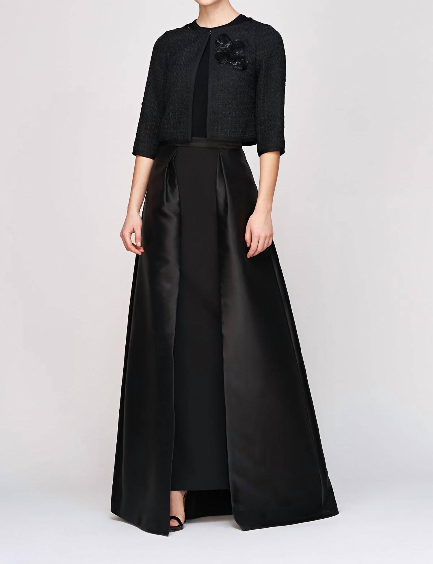 Who doesn't love a good maxi skirt? Elevate your occasion wardrobe with the Kay Unger Isabela Walk Thru Skirt in an elegant black hue. This floor-length maxi skirt boasts a distinctive A-line silhouette with a flared overskirt crafted in luxurious shimmering Mikado, complementing the comfortable stretch crepe underskirt beneath. Perfect for homecoming or Thanksgiving gatherings, this versatile skirt creates a stunning monochrome statement suitable for various pairings. Note that this piece does not include pockets and specific care instructions are not provided.