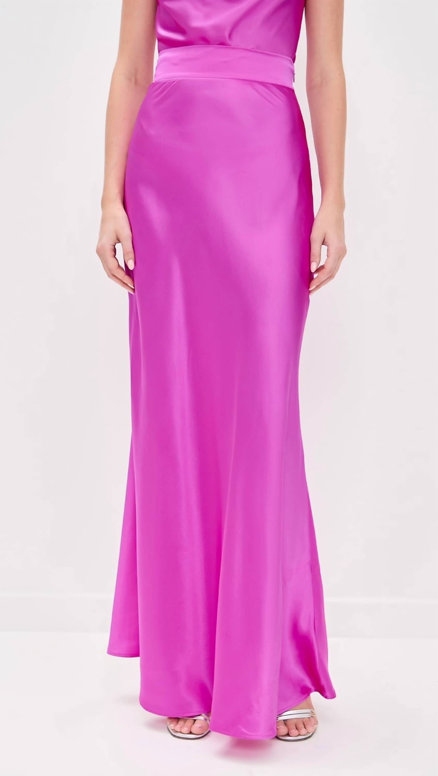 Experience the elegance of the Ryker Waistband Skirt by L'Agence in a striking bright purple hue, perfect for making a sophisticated statement. This women's solid maxi skirt features a 47.25-inch length and is meticulously crafted from 100% silk, ensuring a luxurious feel and flow. Designed with a concealed side zipper, it provides a seamless fit from waist to hem. Finish your look by following the dry-clean care instructions to maintain its refined appearance.