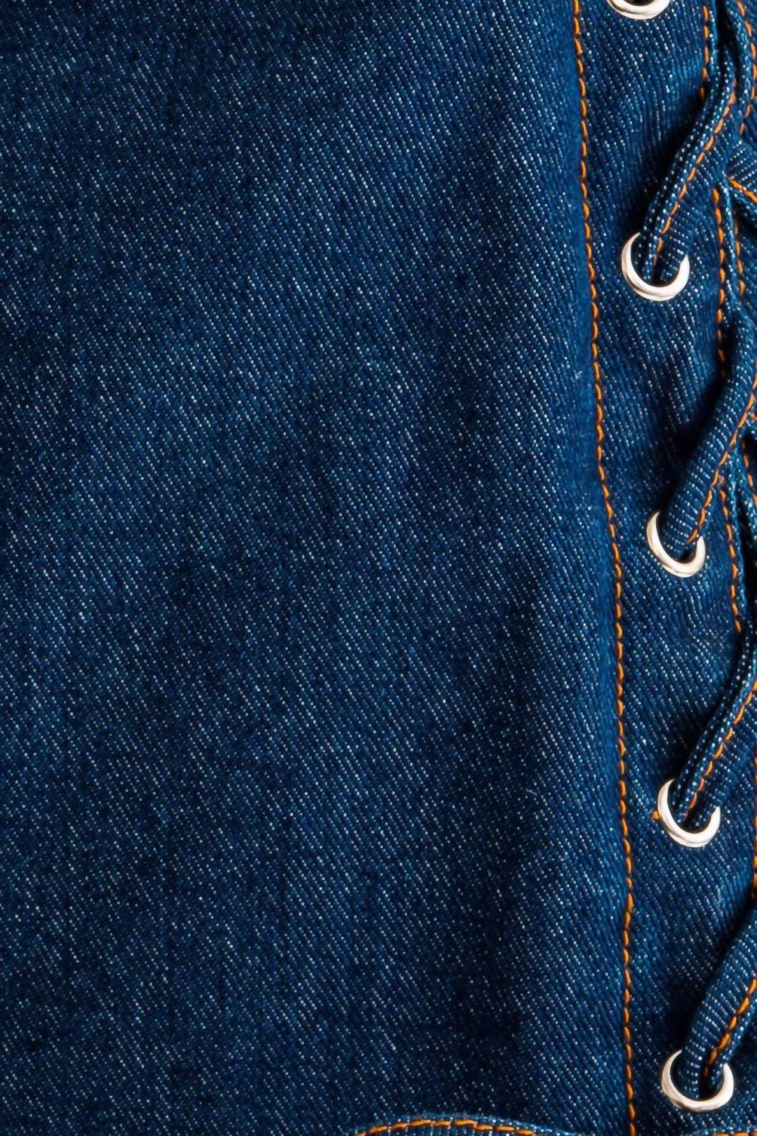 Show just the right amount of leg in this fit flattering mini. Elevate your wardrobe with the Mini Skirt With Bow Tie Detail by LE LIS, perfect for any trendsetter. Crafted from solid denim, this 100% cotton mini skirt features a Western-inspired design with a side lace-up, bow braid-like detail. The button closure ensures a secure fit while providing a stylish edge, complete with functional pockets. For best care, hand wash this piece to maintain its quality. Model is wearing size small (5'8" height, 32A bust, 24" waist, 34" hips).