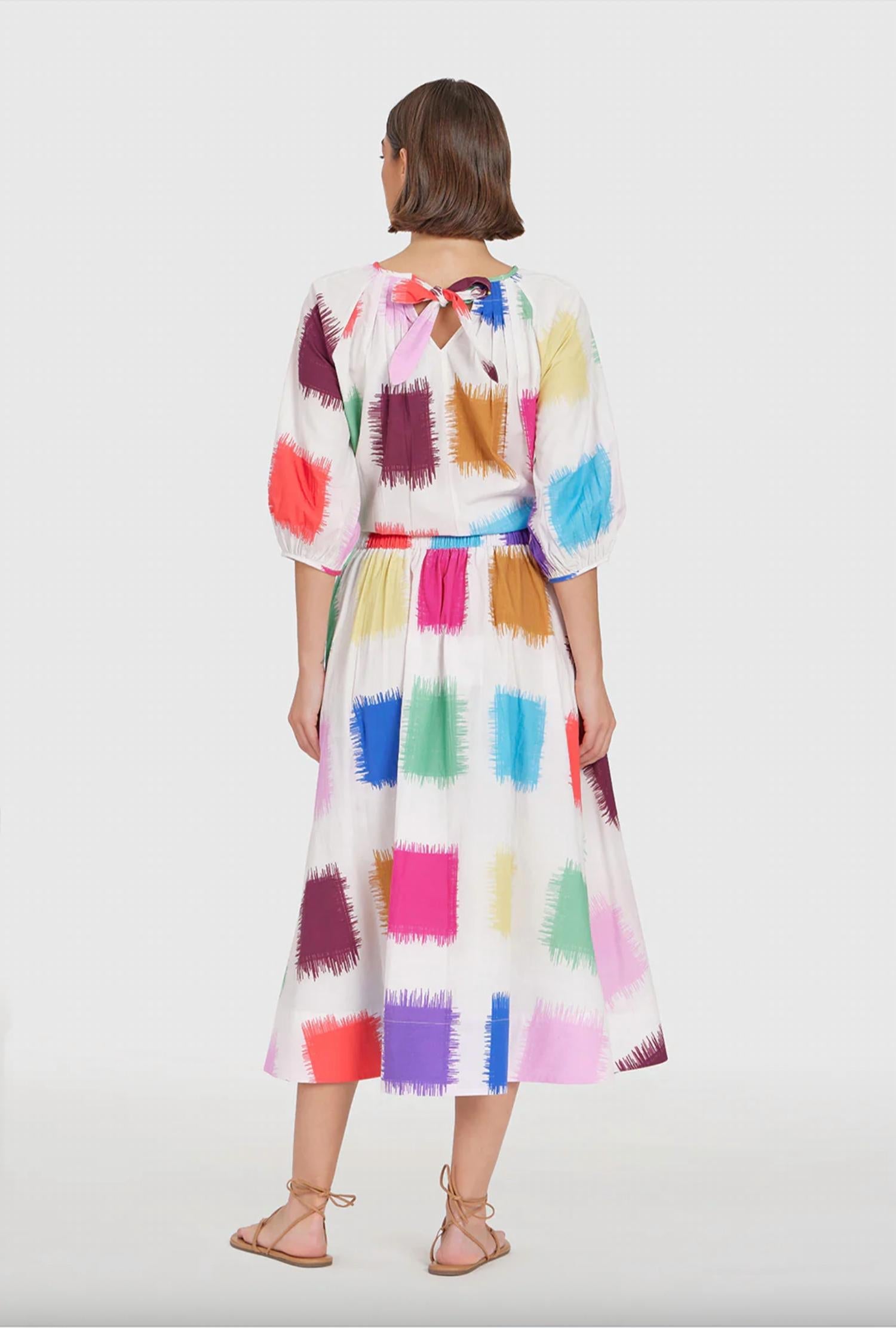 Introducing the Lou A-line Midi Skirt by Livro, a stylish choice for your boho chic summer wardrobe in a vibrant Brushstrokes pattern. Designed with a convenient pull-on closure and an elastic waistband complete with an attached tie belt, this skirt features a flattering A-line silhouette. Made from 100% cotton and expertly crafted in Jaipur, India, it offers both quality and comfort. Care instructions: Hand wash and line dry.