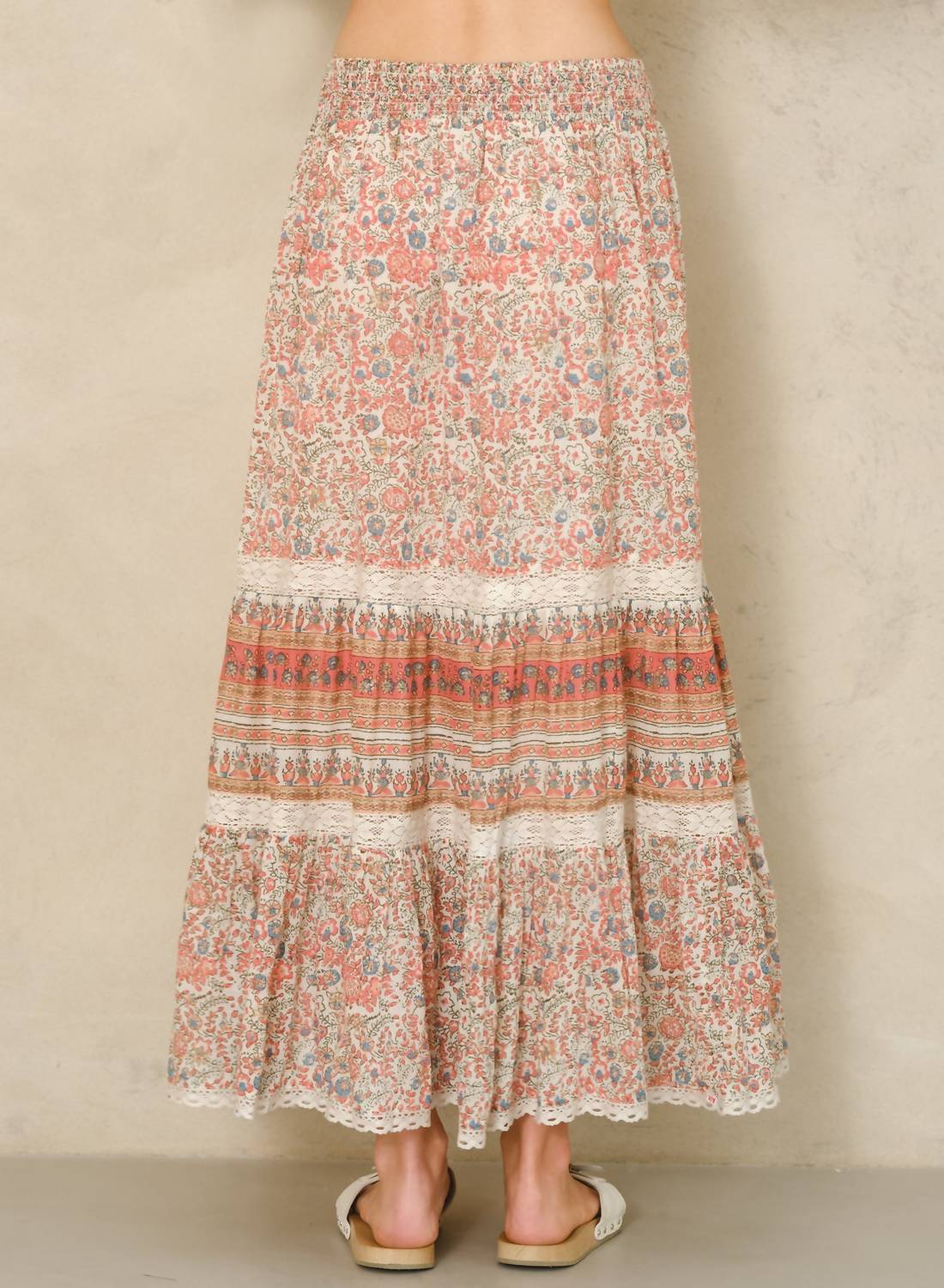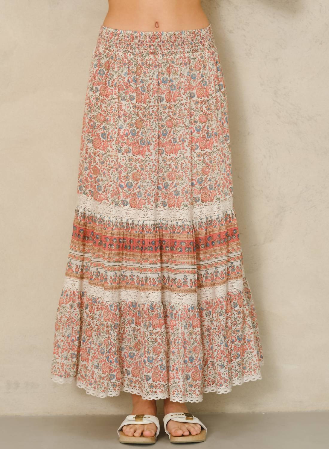 Step into summer with the Cass Print Maxi Skirt by M.A.B.E., an essential piece in vibrant coral. Featuring a lightweight cotton composition, this maxi skirt offers a flowing silhouette that exudes bohemian charm. Made with a pull-on closure for easy wear, its patterned design makes it perfect for vacation occasions. Ideal for versatile styling, it pairs effortlessly with the matching Cass top or a simple white tee.
