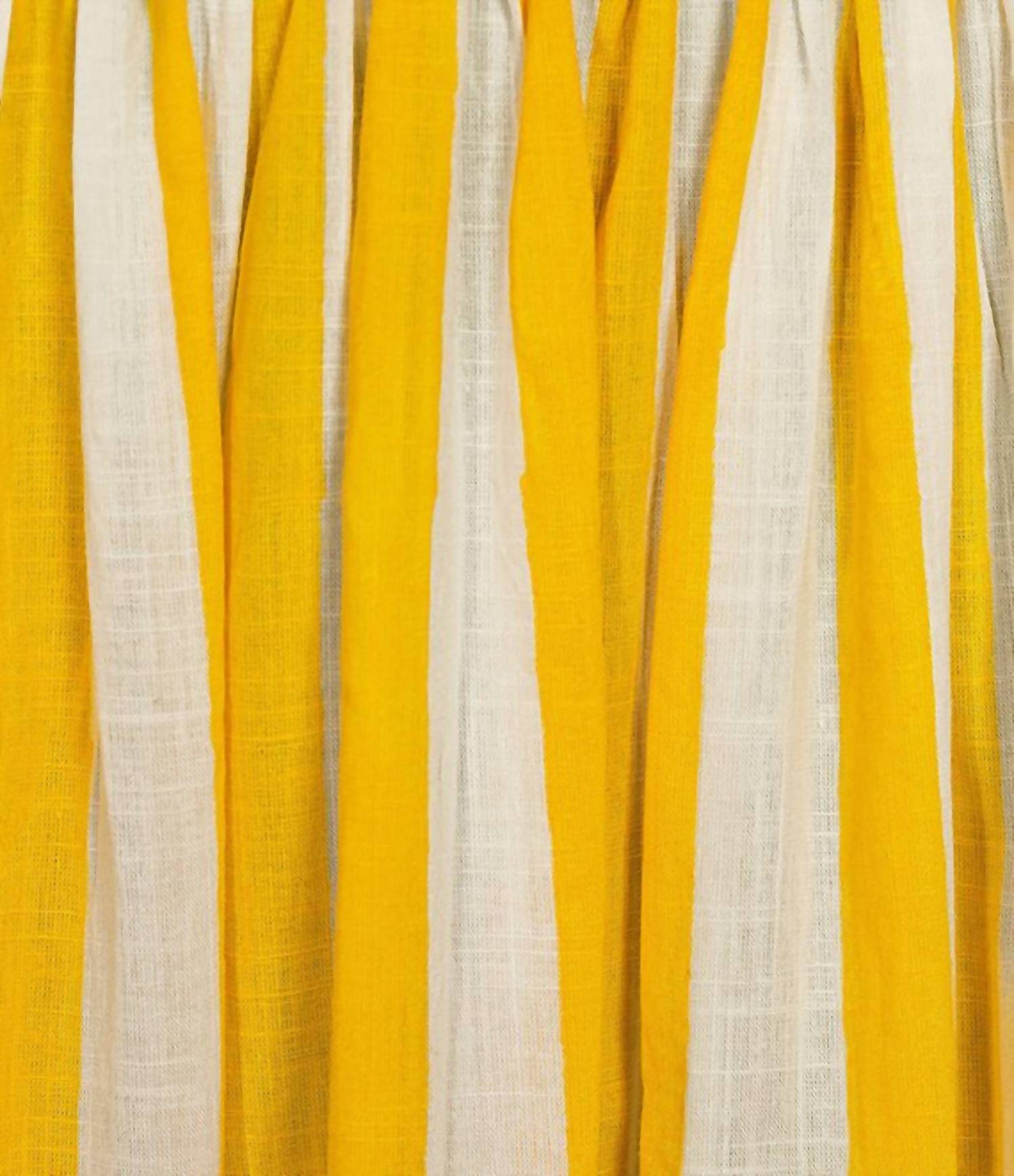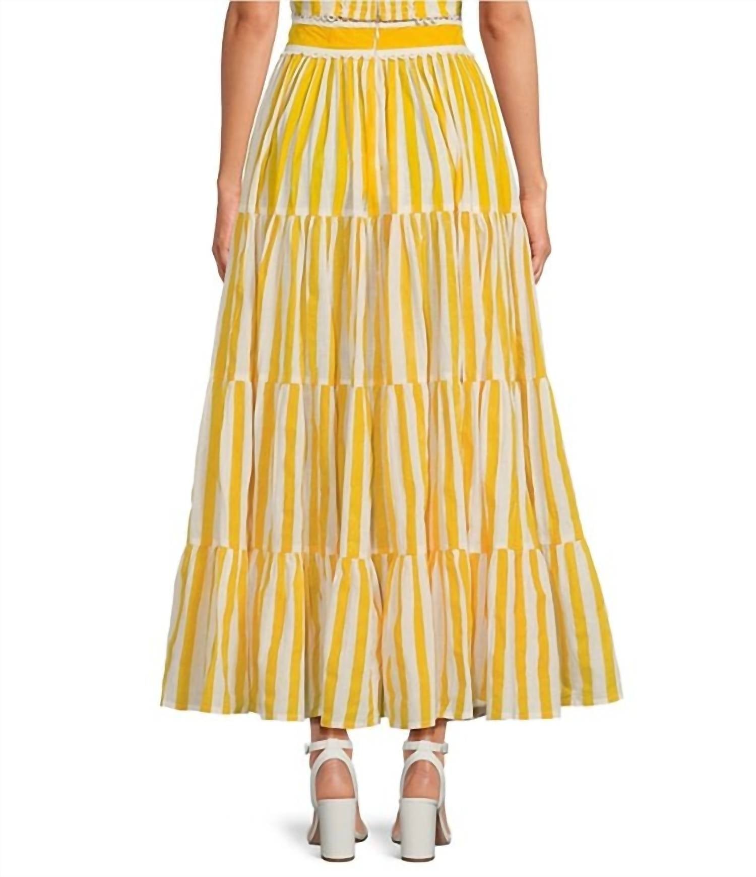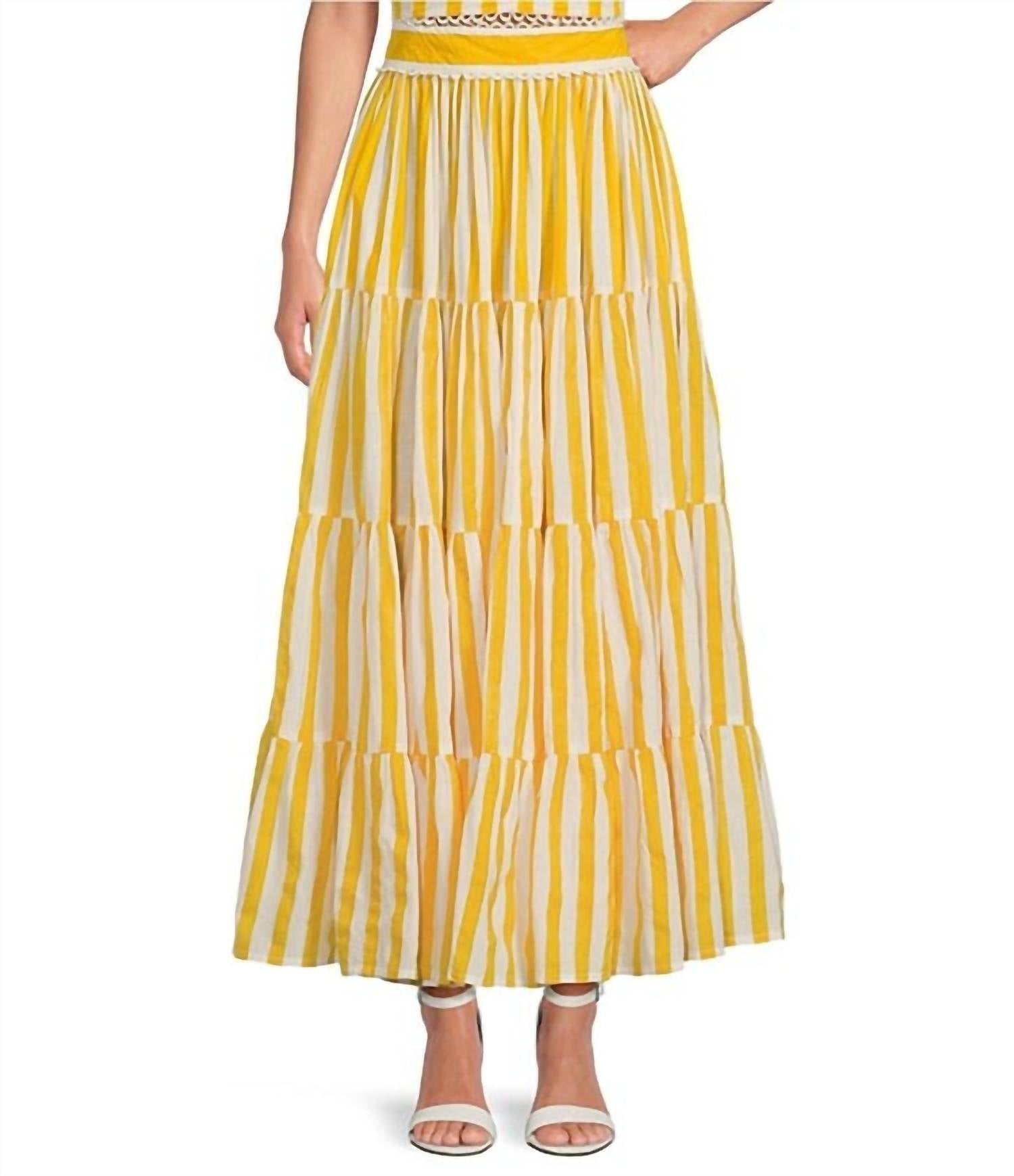 Tuck in your favorite tee for a more casual yet feminine look. Elevate your summer wardrobe with the Le Soleil Stripe Print Maxi Skirt by Mo Maya, a brand revered for its sustainability. This cotton skirt, in an eye-catching yellow stripe print, offers a chic A-line silhouette and a sophisticated scalloped trim detail. Designed with convenience, it features side pockets and an invisible side zipper closure. With a maxi length of approximately 40 inches, this imported piece is perfect for a vacation getaway. Care for it by hand washing and laying flat to dry.