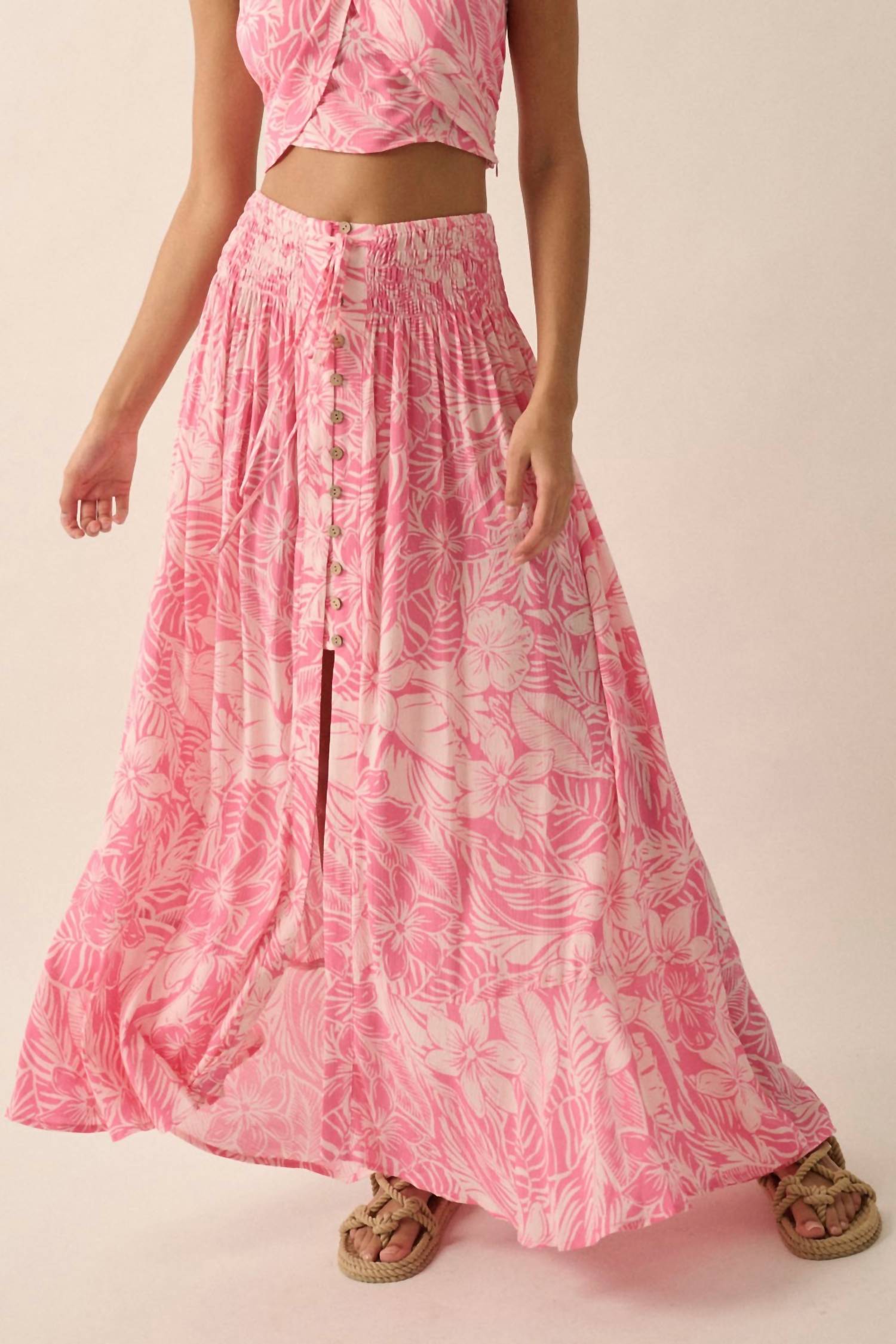 Introducing the Floral Maxi Skirt by PROMESA, a charming addition to your boho chic wardrobe in a delightful pink floral pattern. This women's skirt, crafted from textured crepe rayon, features a high waist and ankle-length design with a smocked elastic waistband and a tie detail for added flair. The half button front closure and front slit add to its relaxed fit, complemented by a tiered ruffle hem. Ideal for spring and holiday parties, the skirt promises effortless elegance with its pull-on style and carefree spirit. Model is 5'9" with measurements of 33" bust, 25" waist, and 35.5" hips, wearing a size small.