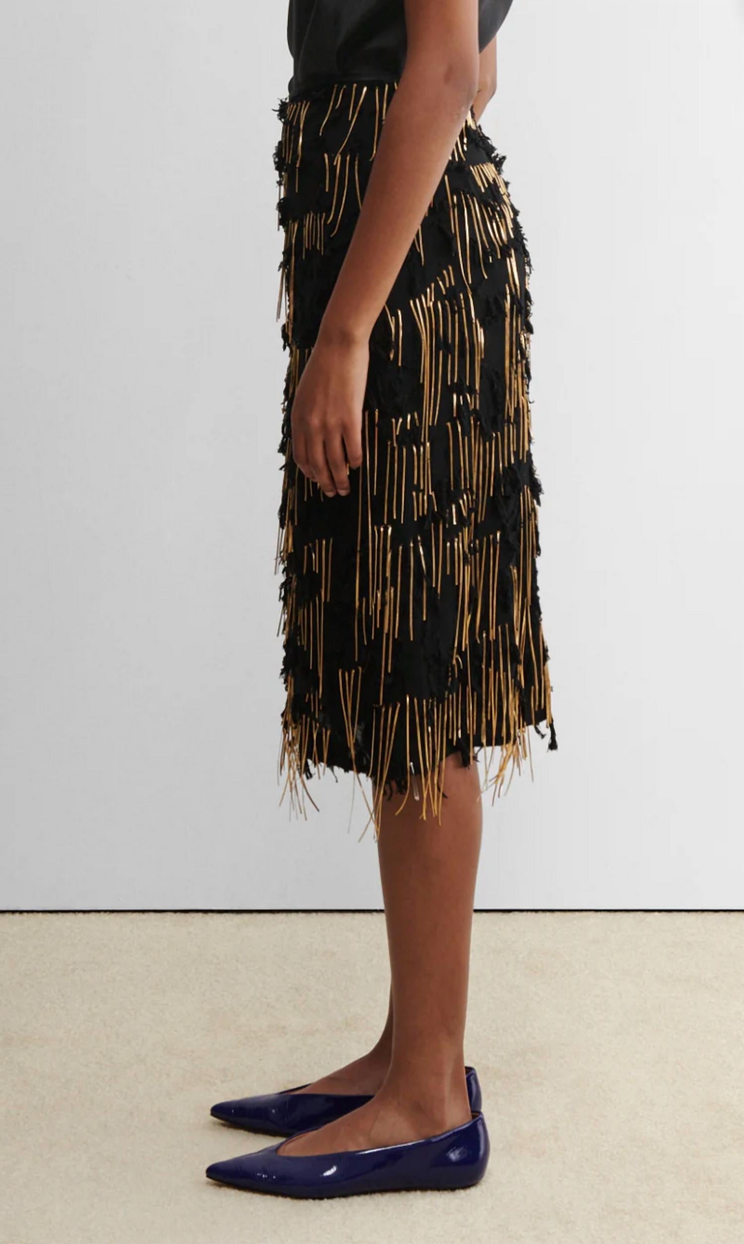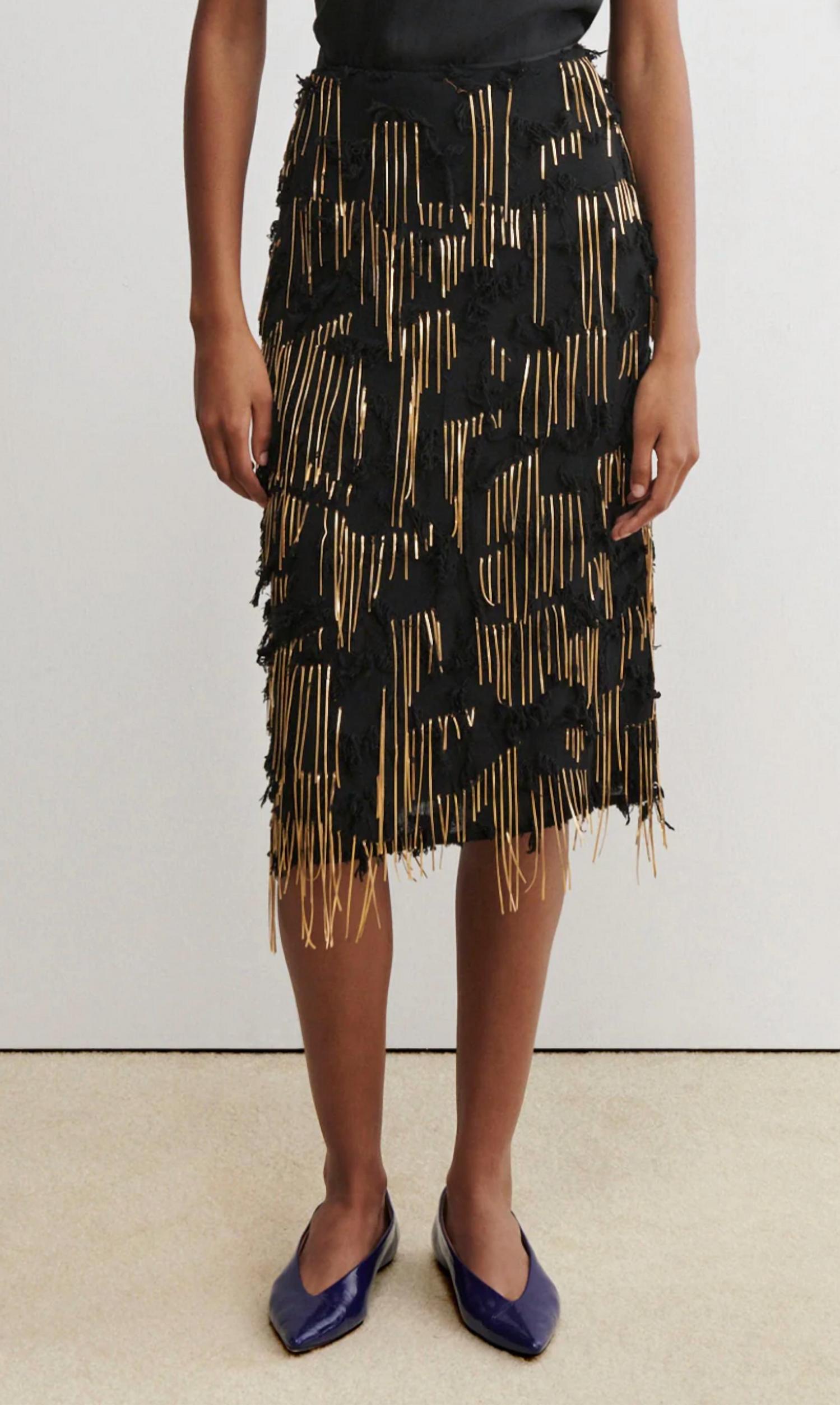 Unveil sophisticated style with the Ayva Skirt by Rachel Comey, a high-waisted midi skirt perfect for dinner parties. This black skirt, made from 100% cotton with a 100% viscose lining, features a stunning fringed design and thin brass embellishments for added glamor. Its concealed zip closure ensures a seamless fit while maintaining elegance.