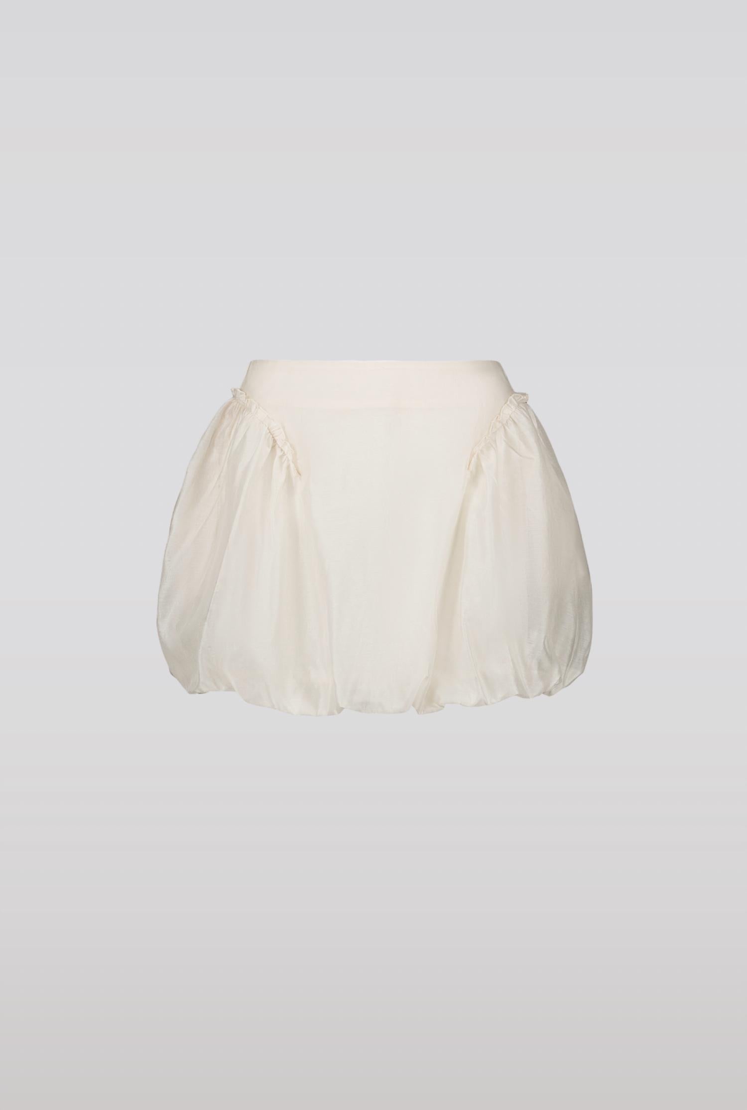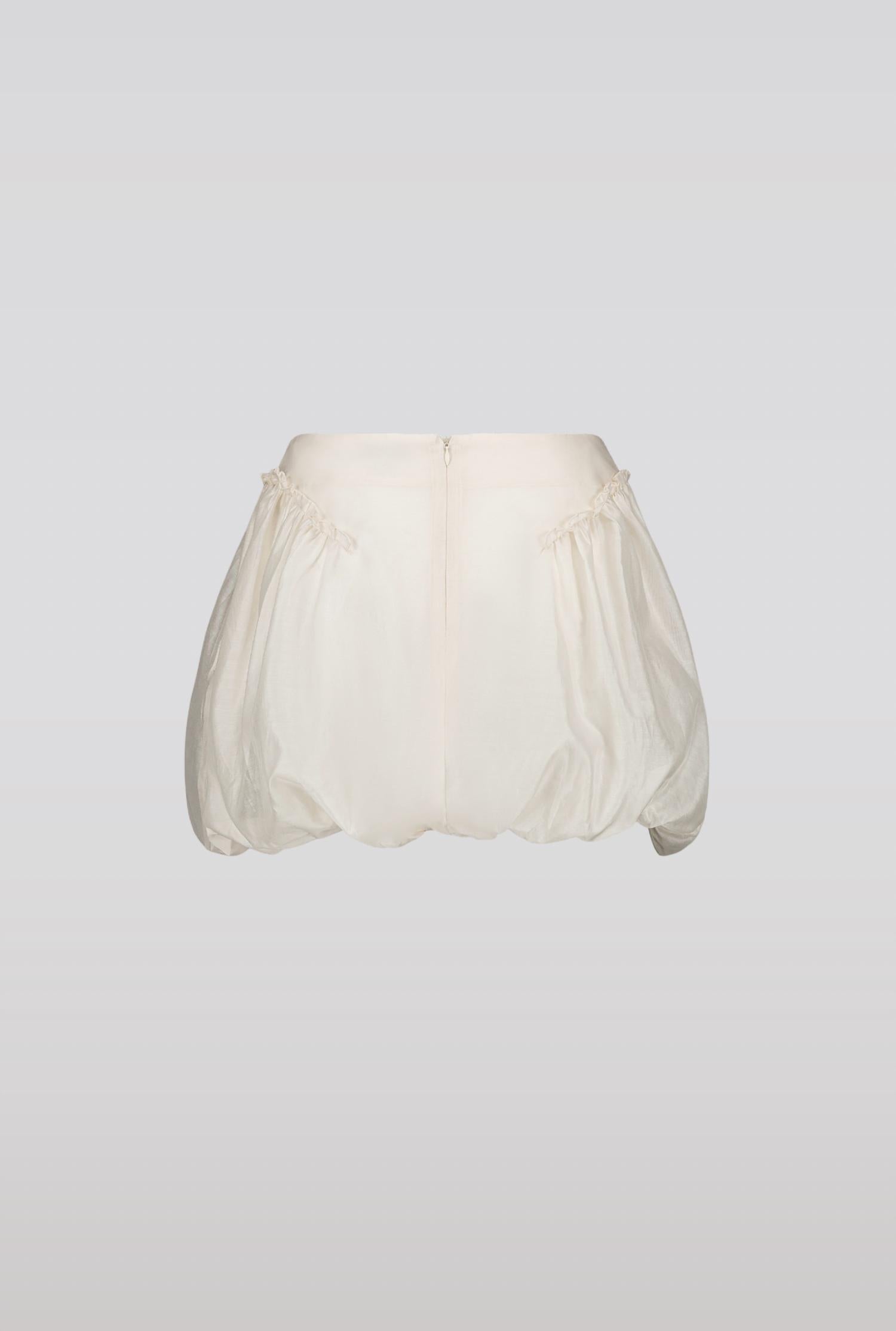 Introducing the Bubble Mini Skirt by SAEMDI, a chic cream piece perfect for a summer outing. Crafted from a luxurious silk blend of 30% silk and 70% cotton, this skirt features practical side pockets and stylish diagonal seams at the hips. Made for women, it offers a zip closure and is lined with 100% rayon for added comfort. Ideal for minimalist trends and holiday parties, this item is true to size, with the model wearing size S.