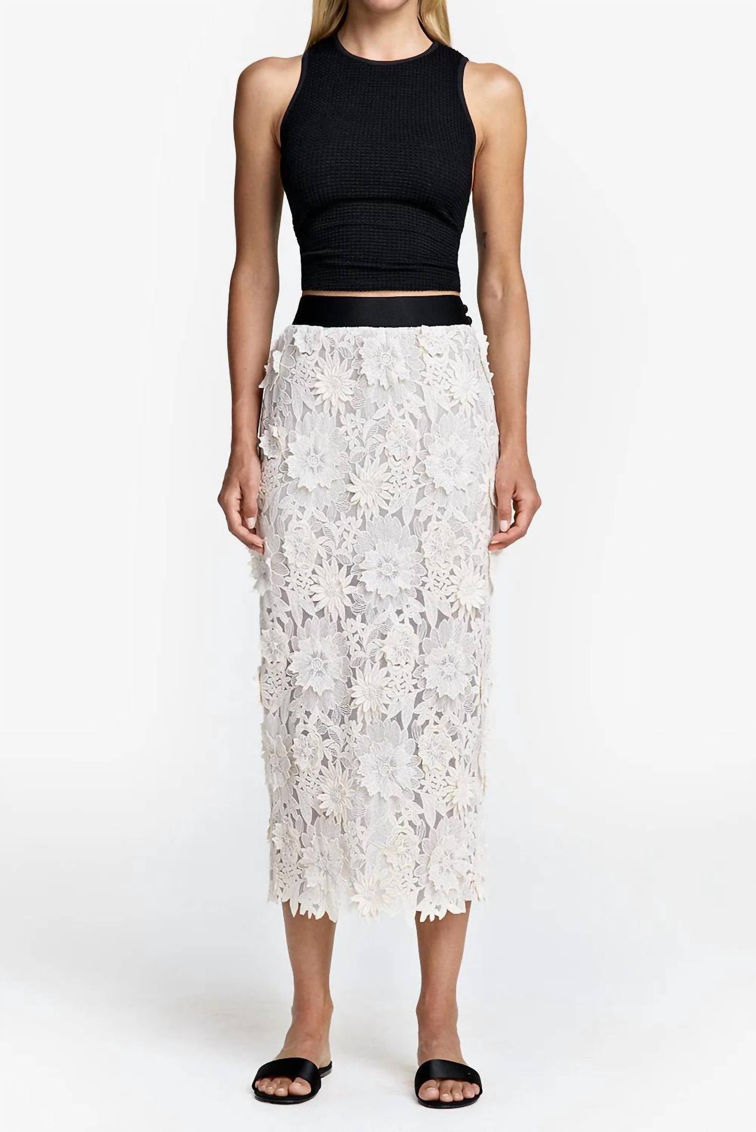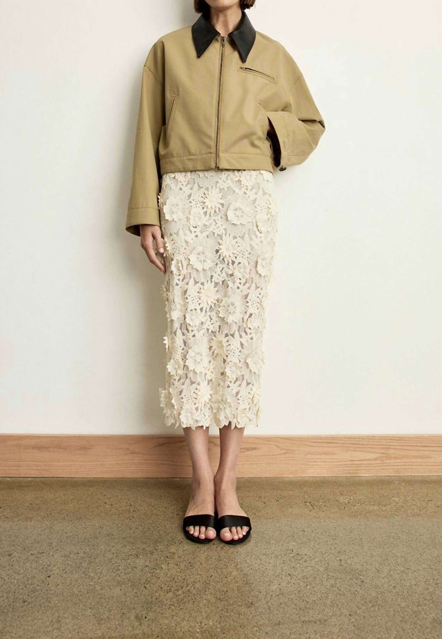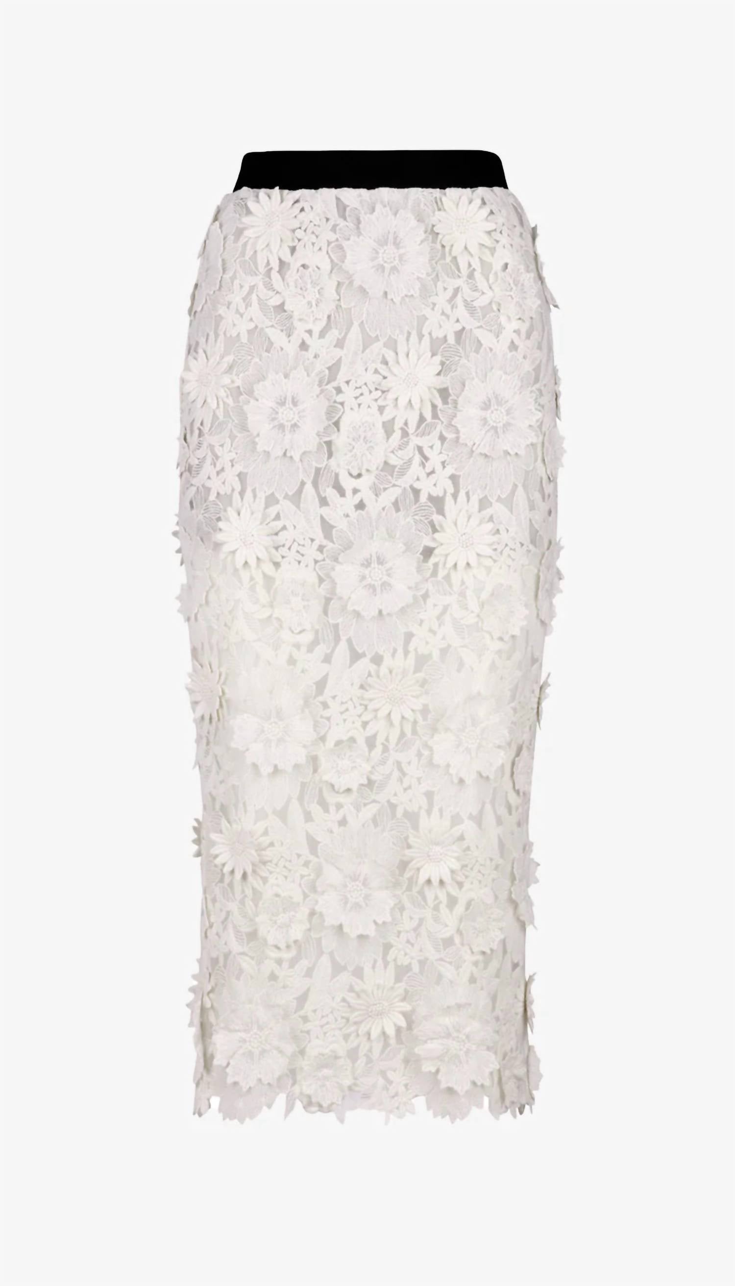 Elevate your style with the Appliqué Pencil Skirt by Smythe, a chic piece in bone perfect for a dinner party. This women's mid-rise skirt features a midi length of 34 inches and showcases a unique appliqué pattern. Crafted from 100% Cotton with a contrast elastic waistband, it boasts a sleek silhouette with a convenient pull-on design. Made in Canada, this skirt is 90s fashion-inspired and requires dry cleaning for optimal care, ensuring your look remains effortlessly refined.