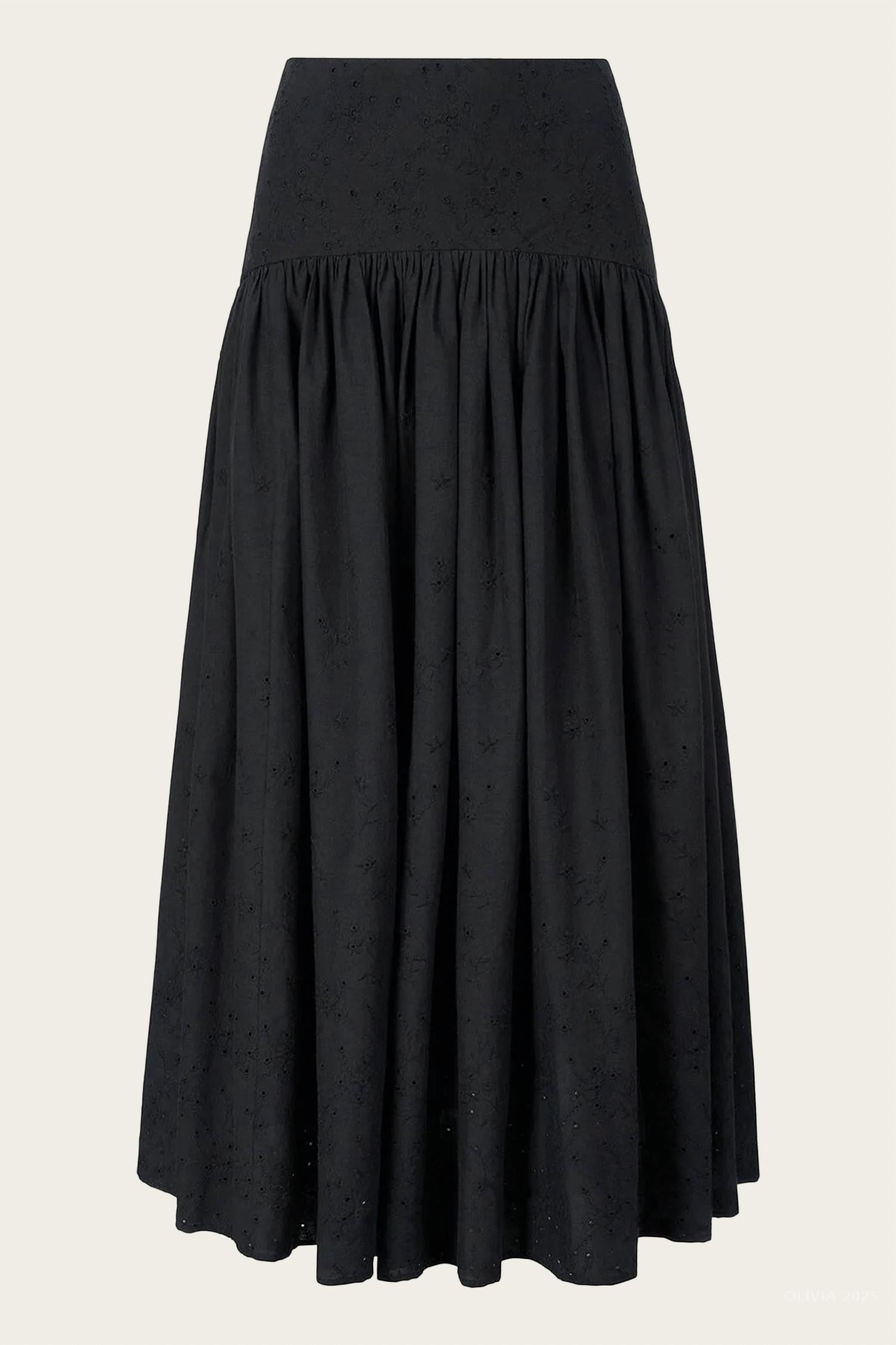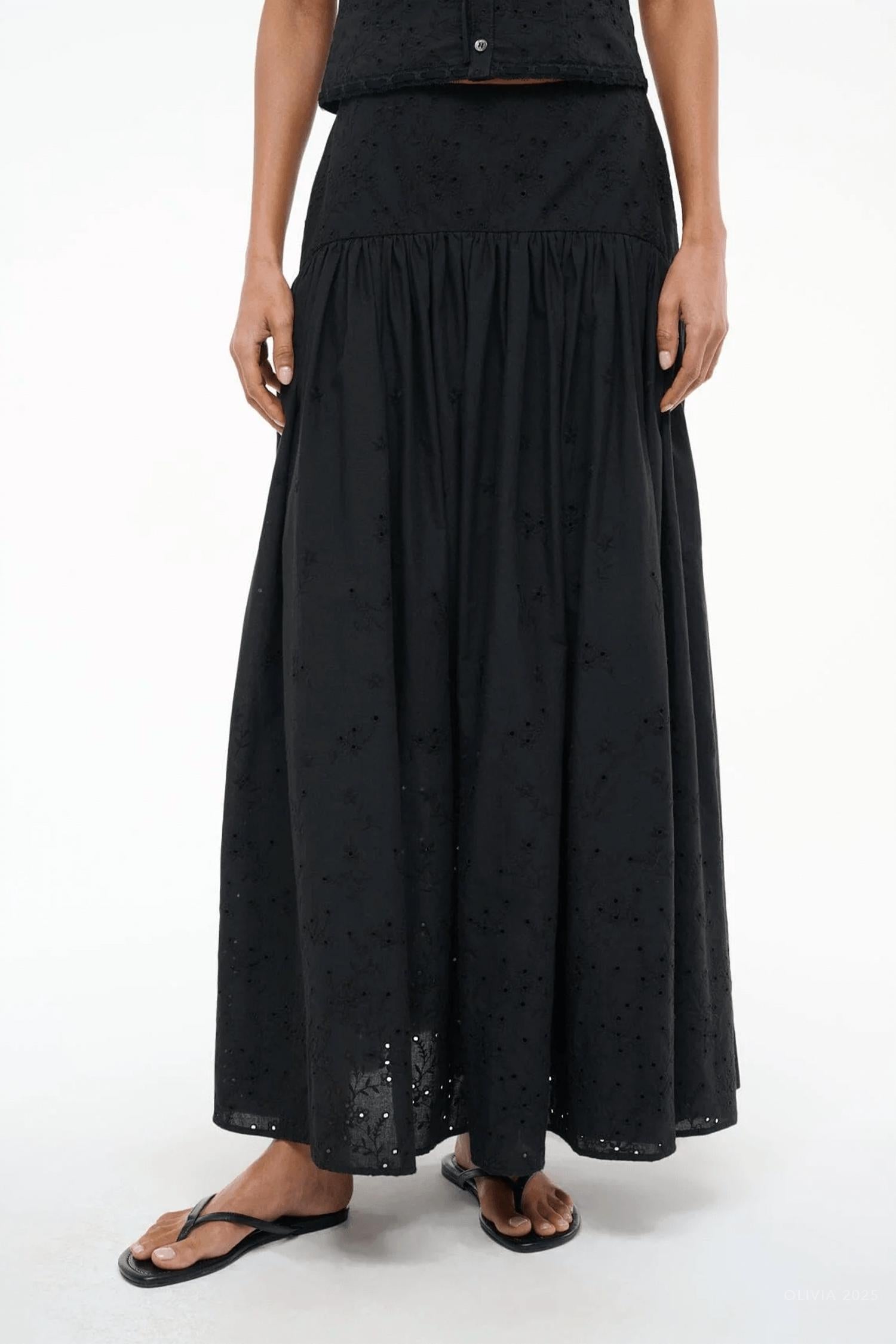 Elevate your wardrobe with the Procida Eyelet Maxi Skirt by STAUD, a perfect choice for a boho chic spring look. This stunning black skirt, crafted from 100% cotton both in its self and lining, offers a sophisticated solid pattern and a zip closure for a secure fit. Imported to ensure quality craftsmanship, this American-sized skirt is a stylish choice for holidays or vacations. Machine washable for convenience, it blends easy care with high fashion.