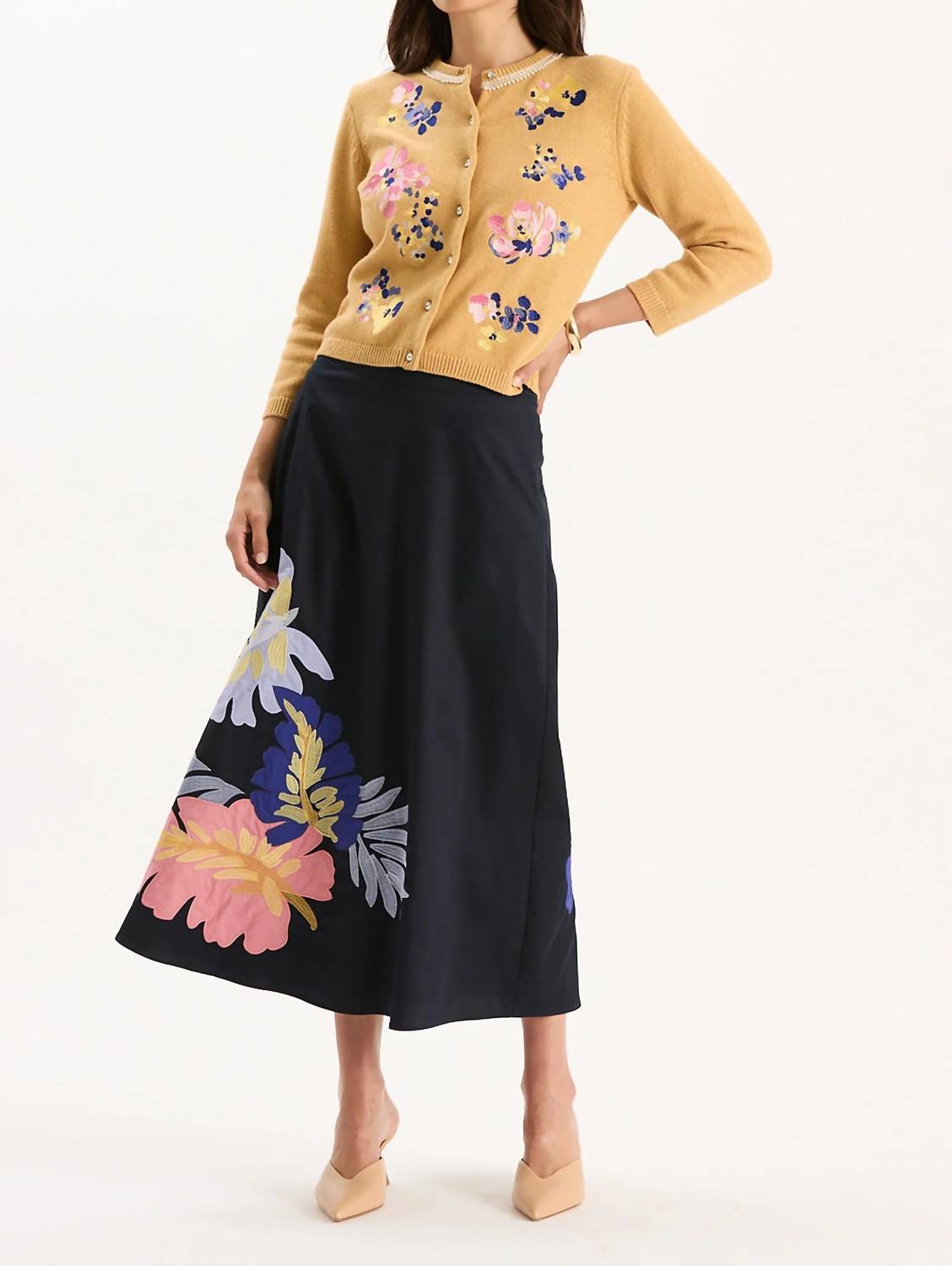Introducing the Valentina Appliqué Skirt by Tyler Boe, a stunningly versatile piece in mid navy. With a graceful 35" midi length, this 100% cotton skirt features exquisite floral embroidery and an A-line silhouette, ensuring a flattering fit for any summer occasion. A comfortable waistband and side zipper closure ensure ease of wear. Care for this stylish skirt by machine washing cold and laying flat to dry. Made in China. Model is 5’9” and wearing a size 4.