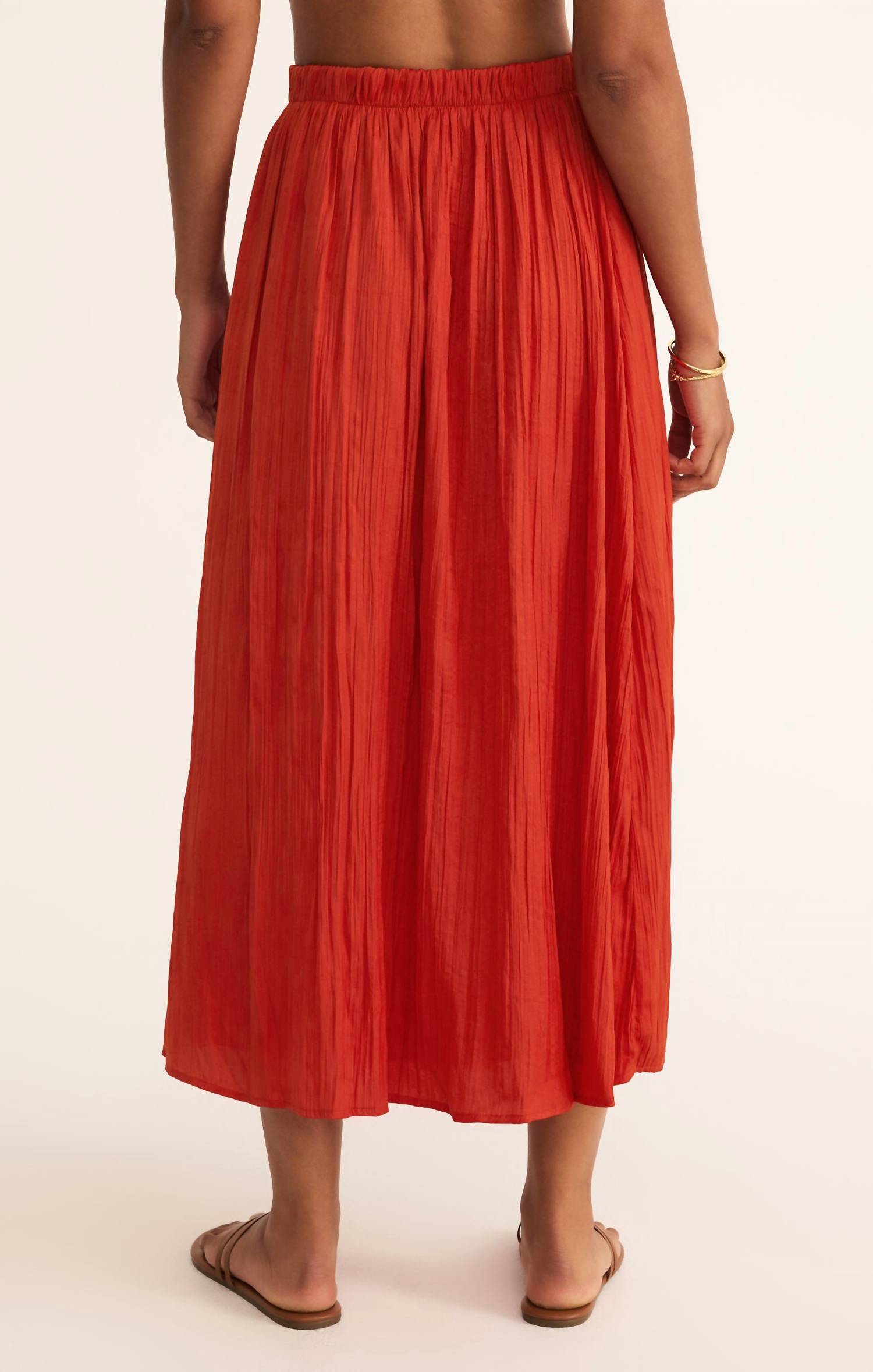 Presenting the Nicoline Crinkle Midi Skirt by Z Supply, designed in a vibrant Cabana Red. This relaxed-fit skirt is crafted from 100% Poly Satin for a soft and silky feel, offering a high-rise, midi-length silhouette that is fully lined. Featuring a comfortable elastic waistband, this skirt is as effortless as it is stylish. Care for this piece by hand washing cold separately and leaving it twisted to dry or opting for dry cleaning.