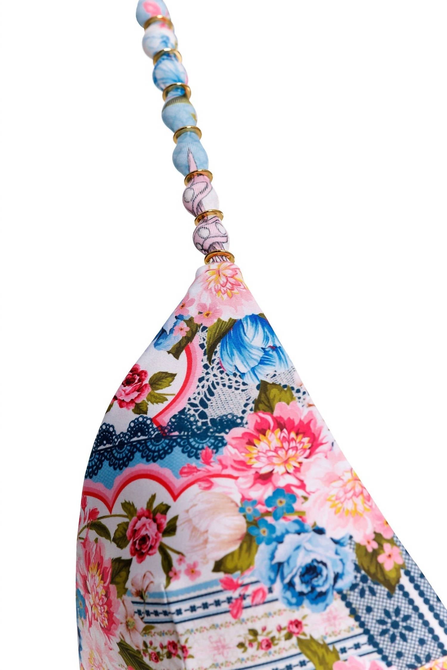 Dream of your next beach getaway in this cute little number. Pair with strappy sandals, a floppy hat, and an oversized tote to complete the perfect vacation look. Elevate your beachwear with the Belle Bikini Top by AGUA BENDITA, a vibrant Meraki piece perfect for a Summer beach day. Featuring a classic adjustable triangle design, it comes adorned with handcrafted beading along the straps. Made from durable 80% Polyester 20% Elastane, this swim top showcases a floral patchwork print and offers UPF 50+ protection. Care includes hand washing and line drying. Our model wears a size S and measures at a height of 5.9", with a bust of 33", waist of 24", and hips of 37".