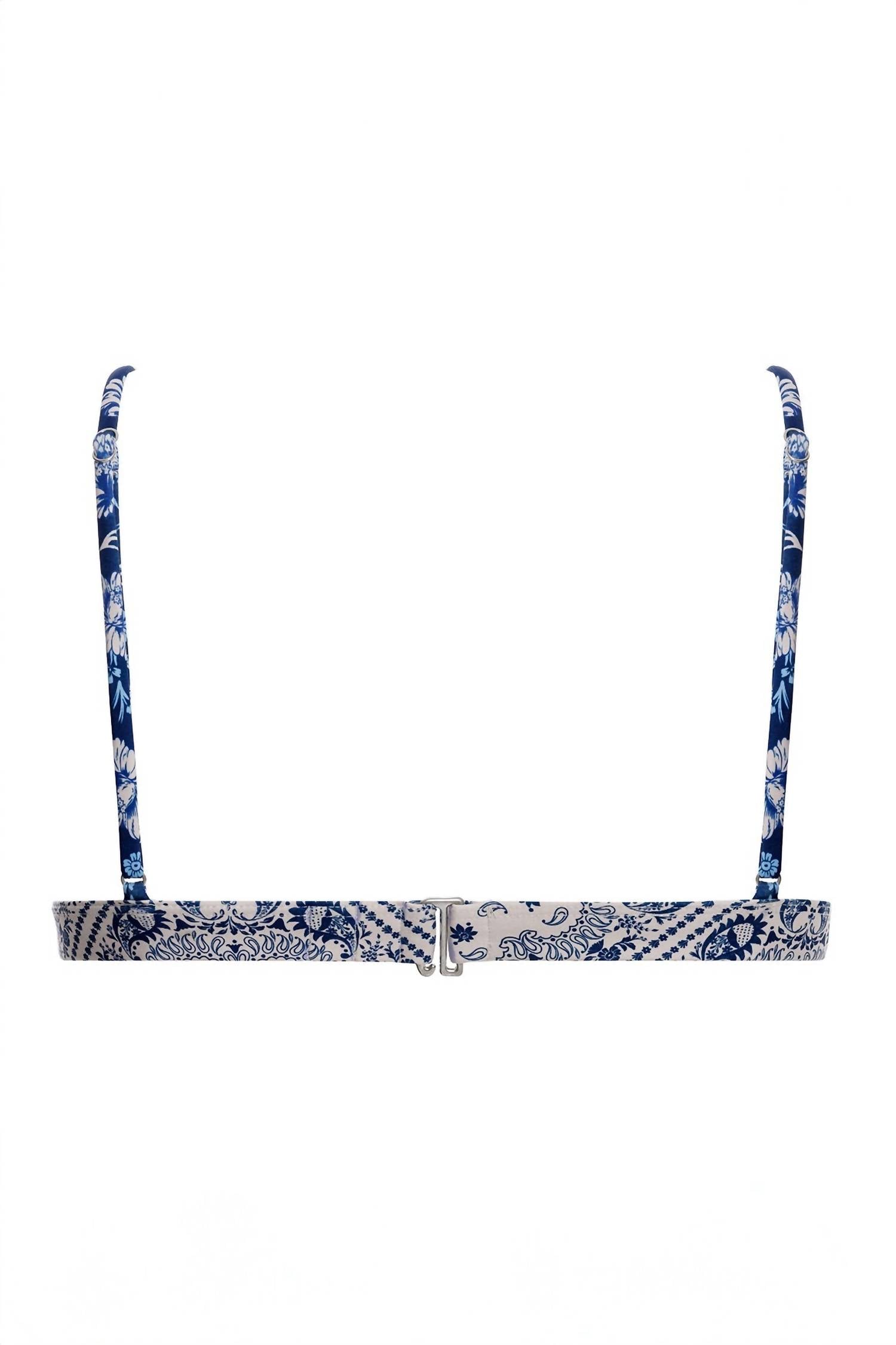 Ideal for relaxed poolside moments, this adorable swimsuit effortlessly transitions into the perfect sunset dinner outfit when paired with a flowing skirt. Experience elegance with a touch of individuality in the Lisa Bikini Top by AGUA BENDITA. Crafted from sustainable 81% Recycled Polyester 19% Elastane, this patterned triangle top in Atma features exquisite embroidered details and a classic coverage design. Enjoy a personalized fit with adjustable straps and removable cups, offering comfort and UPF 50+ sun protection. Care for this boho-chic piece by hand washing and line drying for lasting quality. Model wears a size small (5'11" height, 33" bust, 24" waist, 37" hips).