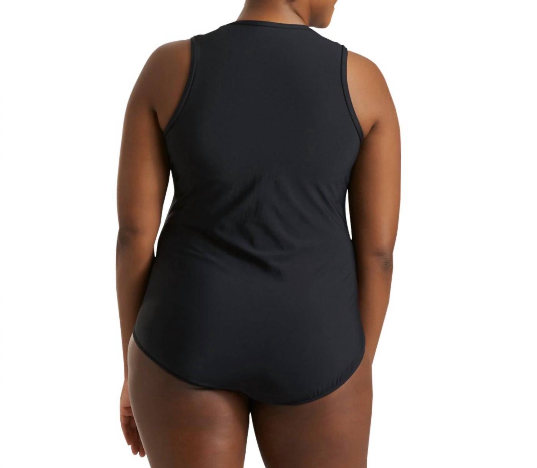 Este maiô veste como uma luva e cobre todas as áreas. Este maiô plus size possui painel frontal e laterais e costas pretas lisas. Painéis laterais em tela frontal completa, afinadores, com zíper dourado estampado, fabricado nos EUA. Composição do tecido: 82% náilon, 18% elastano.