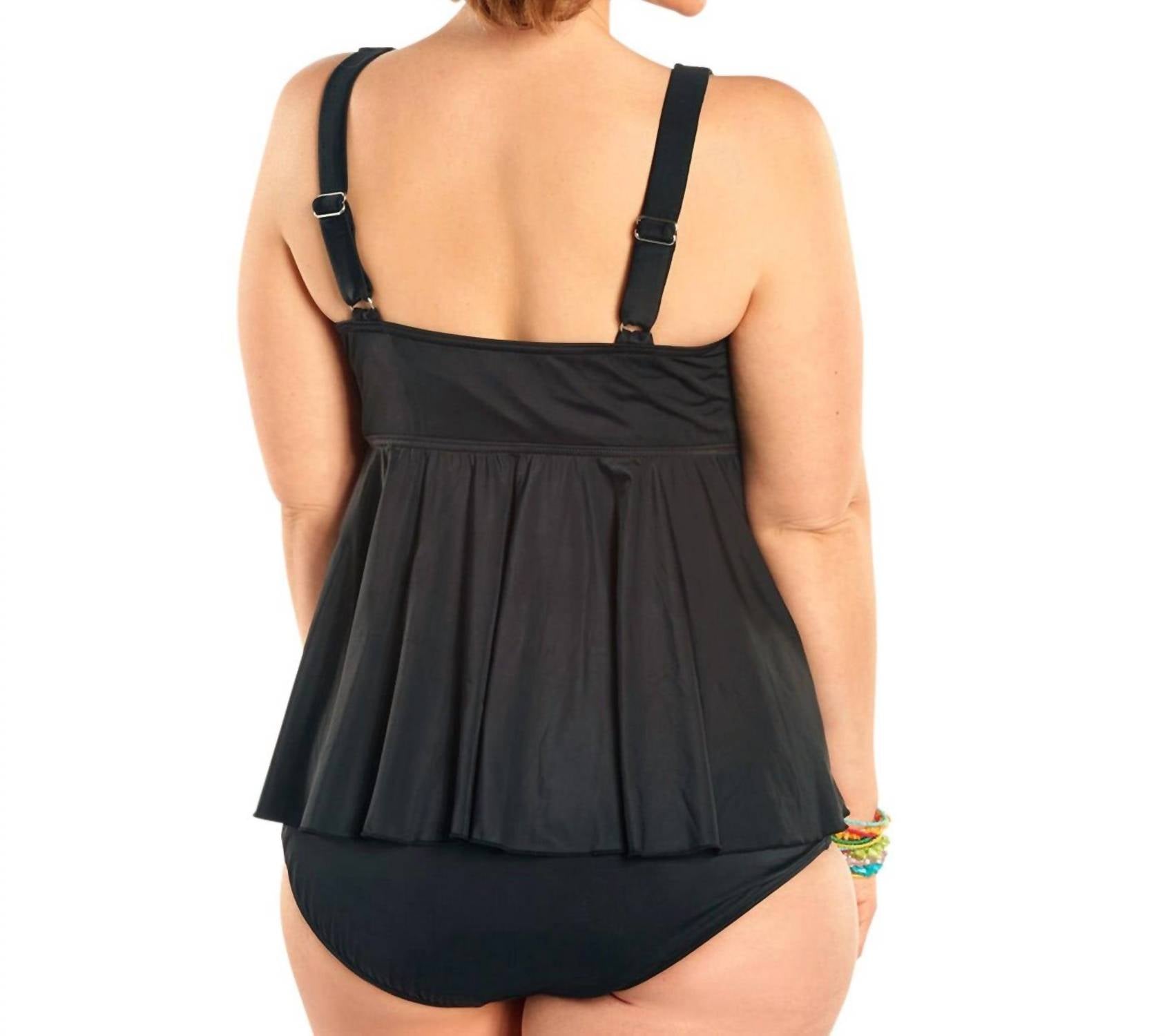 Este maiô fofo e charmoso é perfeito para dar um mergulho na piscina, relaxar em praias ensolaradas e manter o estilo durante o próximo verão. Este é o pequeno tankini preto que toda mulher plus size deve ter, pois ele tem a capacidade de fazer maravilhas com praticamente todos os tipos de corpo. A parte de cima tem decote em V e alças ajustáveis. A parte de baixo do tankini oferece cobertura total para um uso confortável.