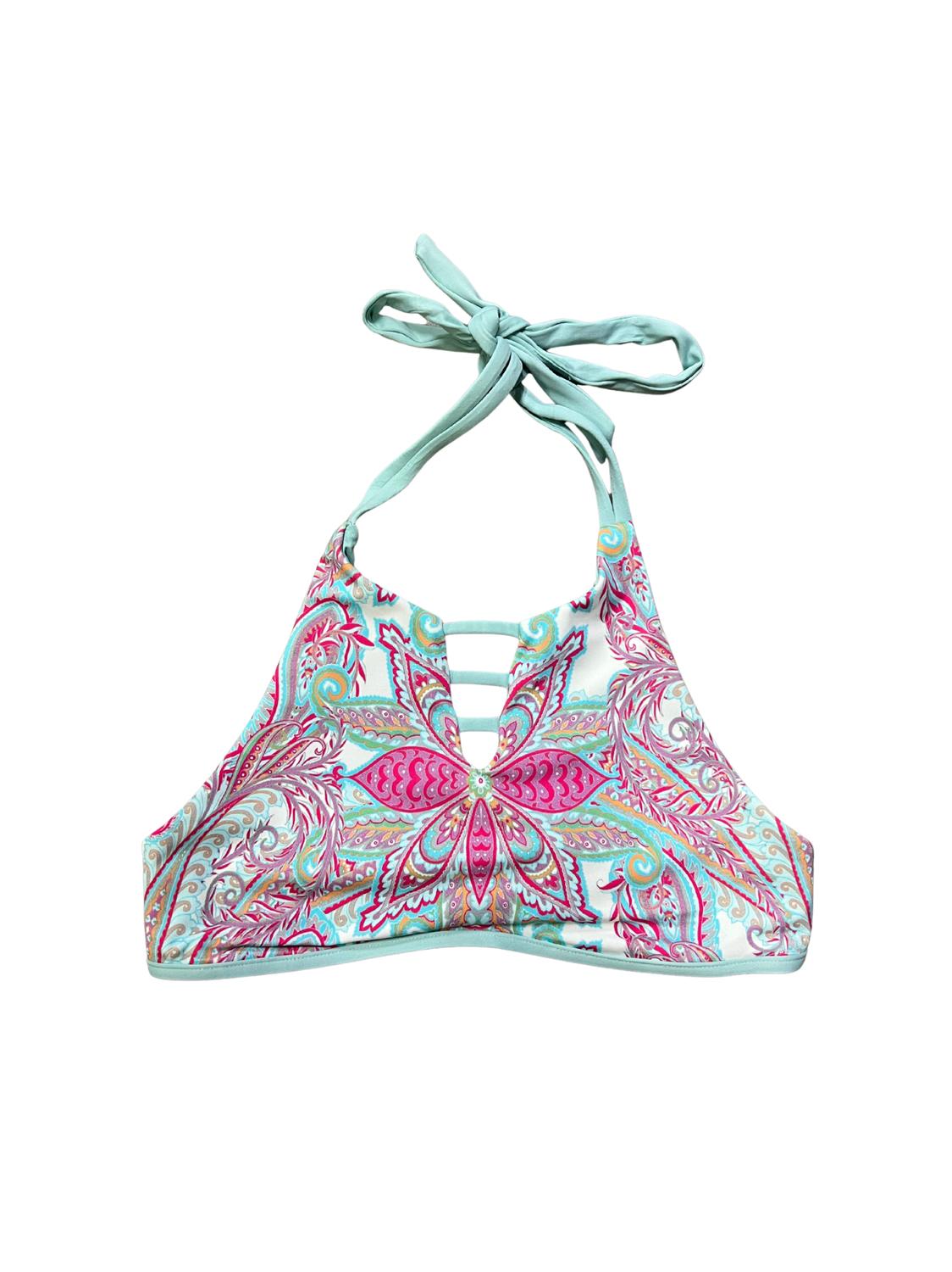 Introducing the Island Hi-neck Swim Top by B Swim, a stylish floral bikini piece in Island Blossom White, perfect for your vacation wardrobe. It features a v-neck with cutout detail and double spaghetti front halter ties. Crafted from a nylon blend, the material is composed of 82% Nylon and 18% Spandex. Designed to fit up to D cup sizes, this top requires hand washing and should be laid flat to dry.