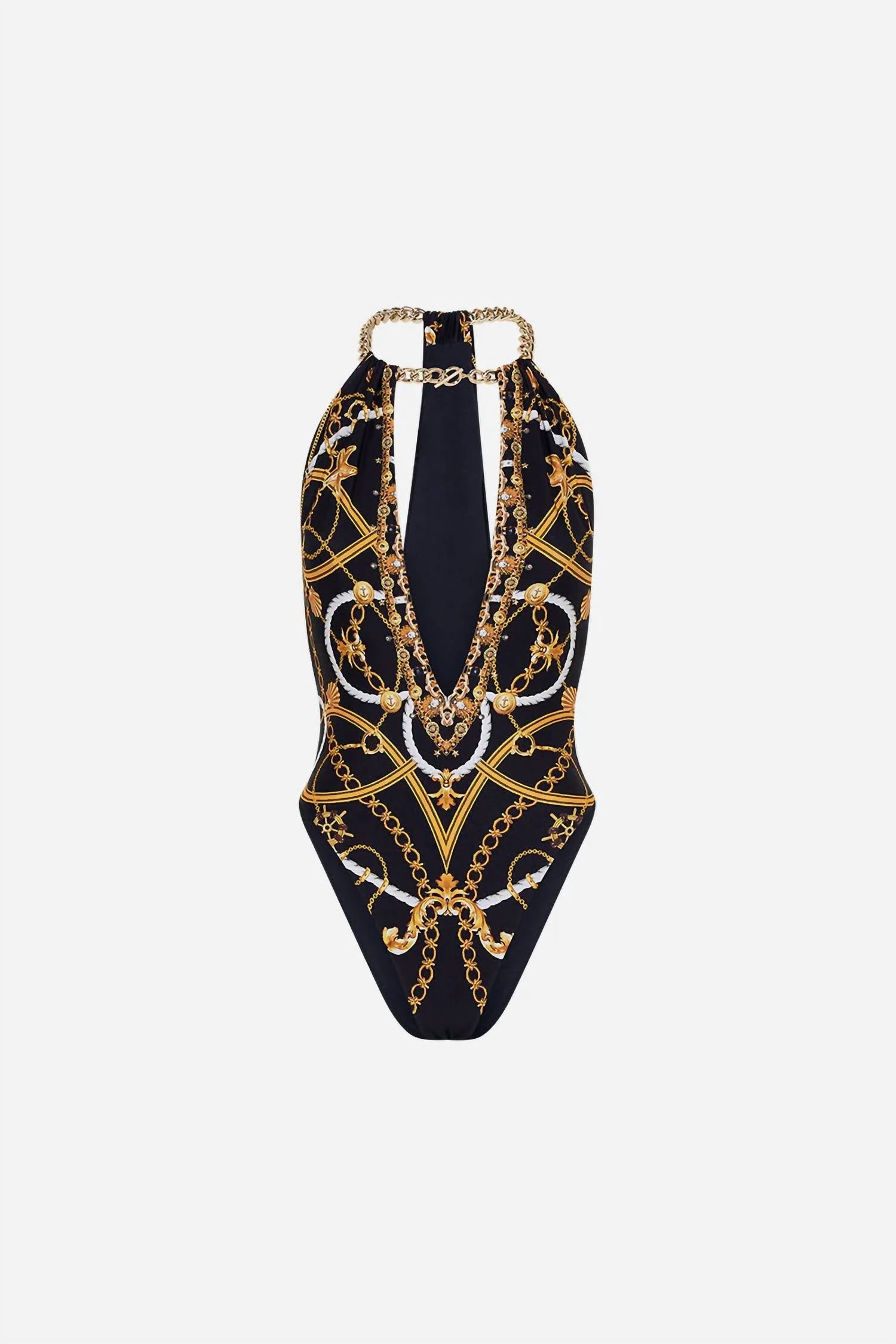 Introducing the Chain Neck Plunge One Piece by Camilla, a stunning addition to your summer wardrobe in the vibrant "Coast To Coast" pattern. This swimwear piece is crafted from an 82% Nylon and 18% Elastane blend, featuring a dramatic deep V neckline with signature crystal embellishments and unique custom gold chain hardware at the decolletage. Its racerback design and subtle ruching on the hips ensure a flattering fit, perfect for a stylish beach day with extra cheeky coverage. Care Instructions: Hand wash separately in cold water and lay flat to dry.