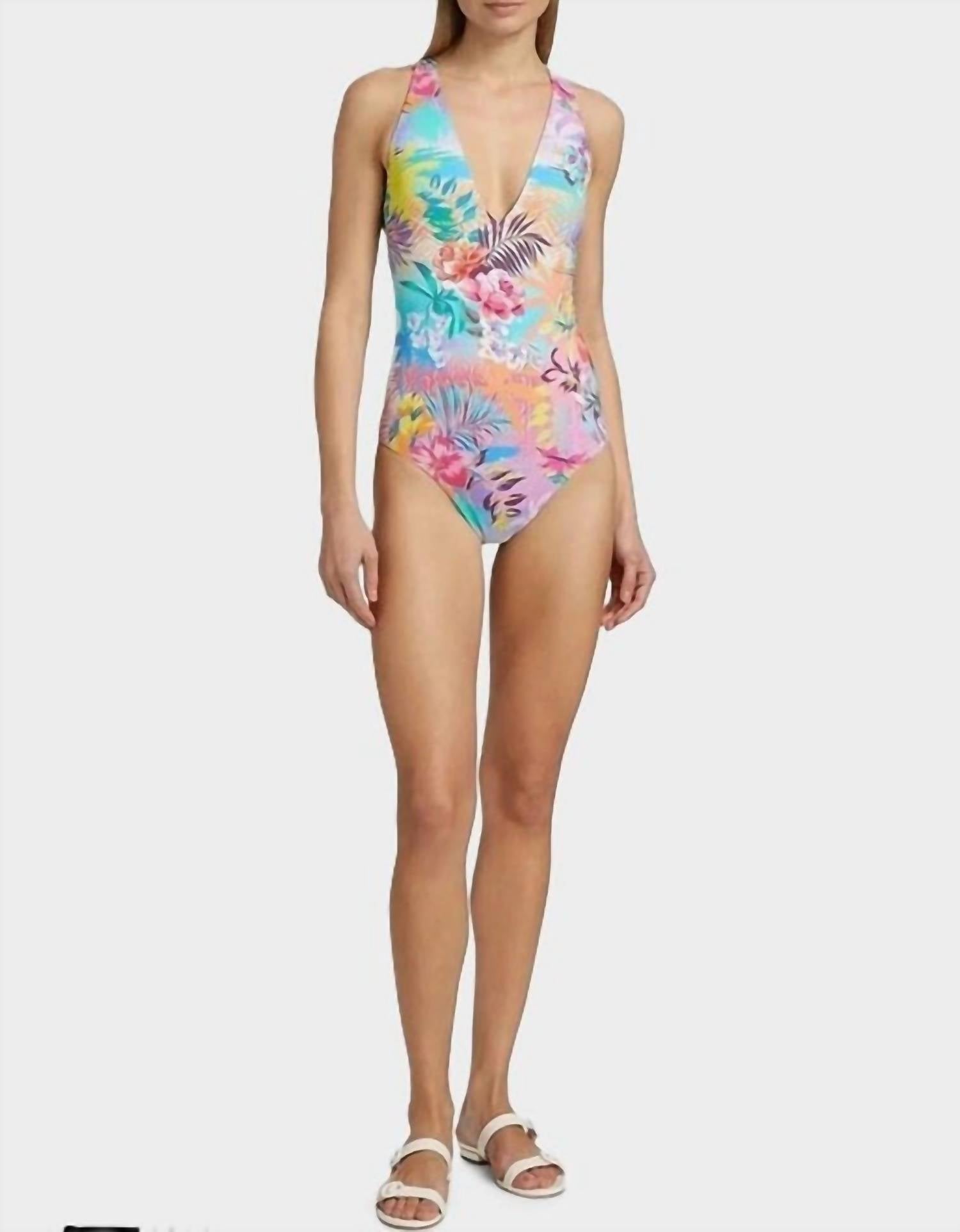 This one piece fits like a glove and covers all the right areas. This stylish cross-back features a unique Hawaiian floral print and a plunge V-neckline. Pair it with the Zeru Wide Leg Pants and go comfortably from beachside to brunch. Model is 5'8" and wearing a size XSmall. Hand Wash.