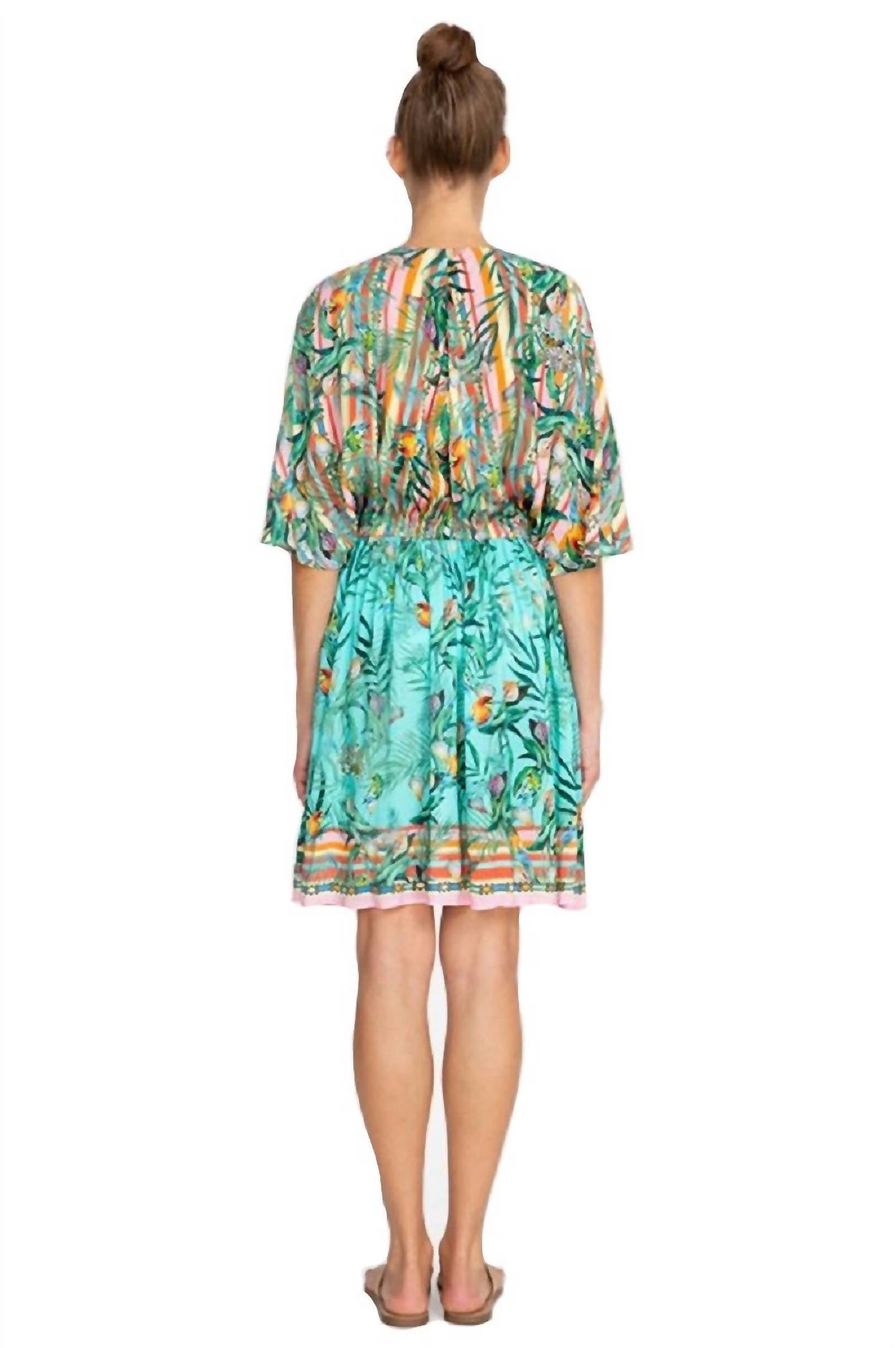 Sua saída de praia favorita para festas na piscina, dias de praia e feriados prolongados. Estampa inspirada na natureza e silhueta fluida. 100% viscose. Decote em V. Manga dolman. Cintura elástica. Caimento relaxado. Altura da modelo: 1,78 m. Lavar à mão com água fria separadamente. Não usar alvejante. Secar no varal. Passar a ferro em temperatura fria, se necessário.