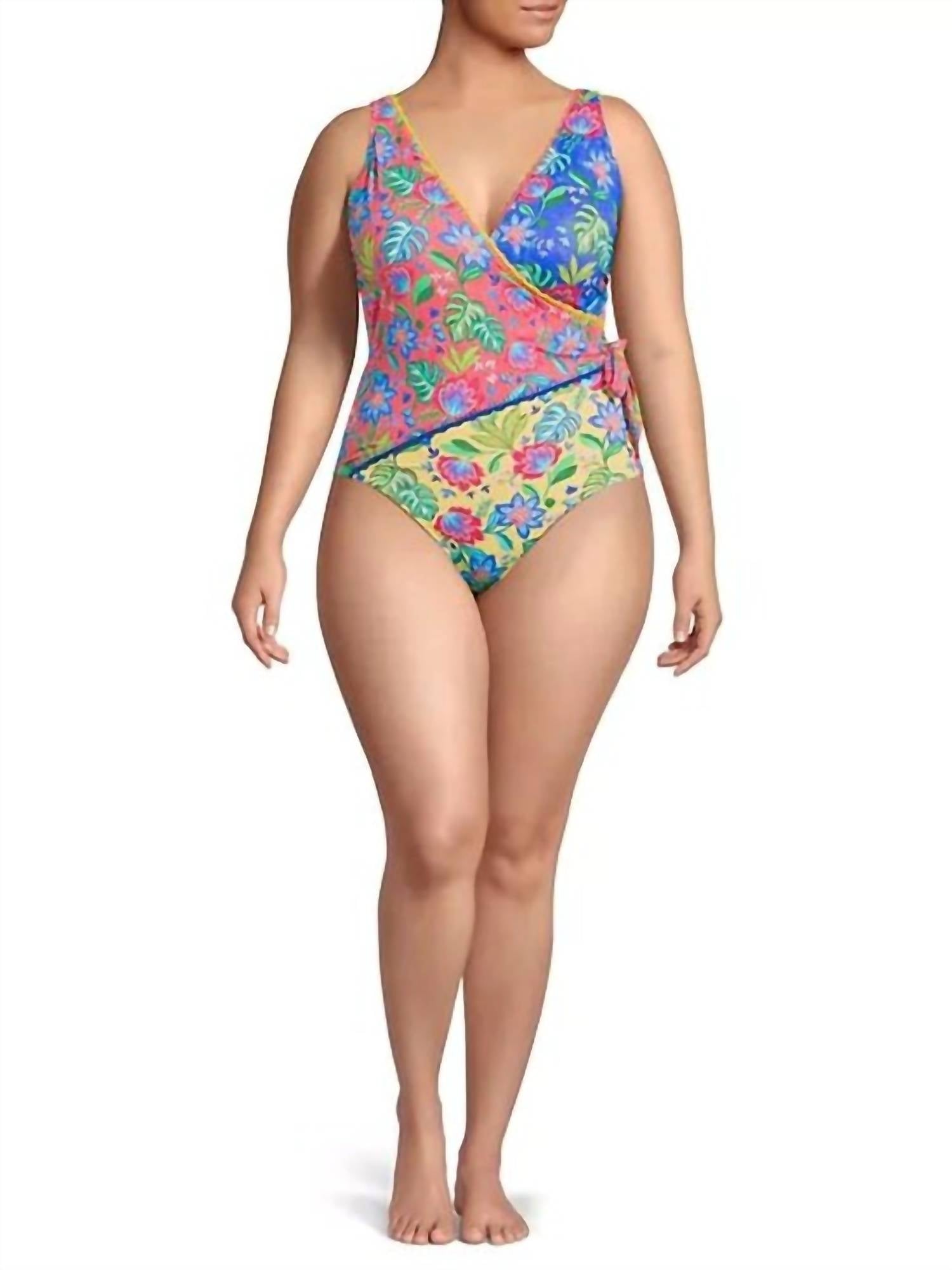 Um macacão tão chique que você pode até usá-lo como body com seu jeans favorito. Entre no verão com este maiô vibrante e chique, com uma estampa floral ousada em blocos de cores, realçada por acabamento em crochê e pespontos no decote e na frente, para um toque único e chamativo. Projetado para estilo e conforto, inclui decote cruzado, alças ajustáveis, bojos removíveis e oferece cobertura moderada nas costas.